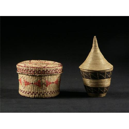 Two small baskets with lids to include a non-native straight sided basket with a flat top lid, polychrome geometric design, 3''H x 5'' diameter. Also included is a small African cylindrical basket with a pointed cone shaped lid, geometric inset design, 7''H x 3 1/4'' diameter with lid.