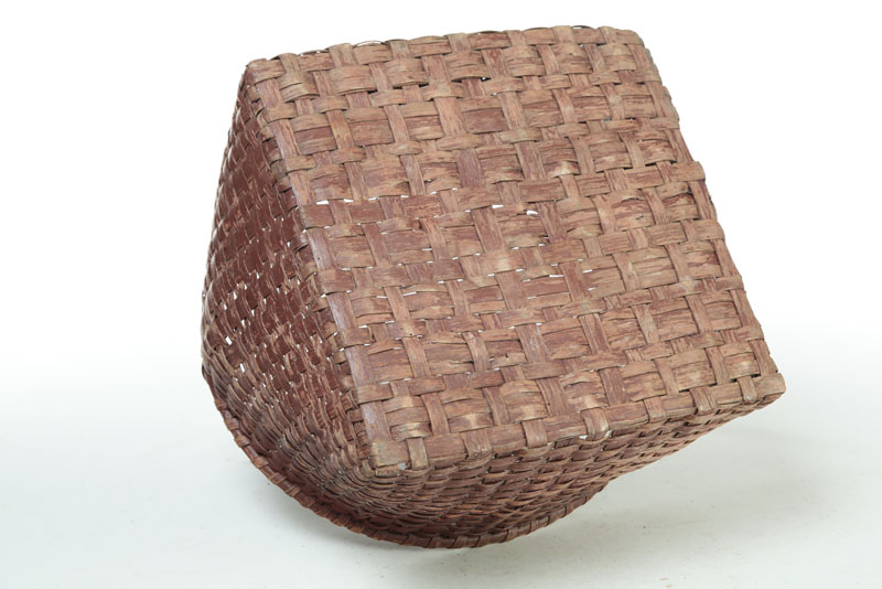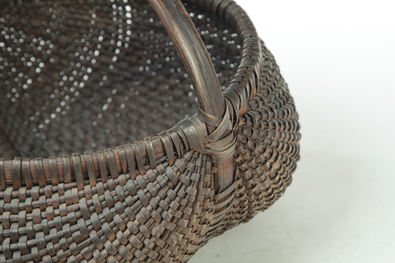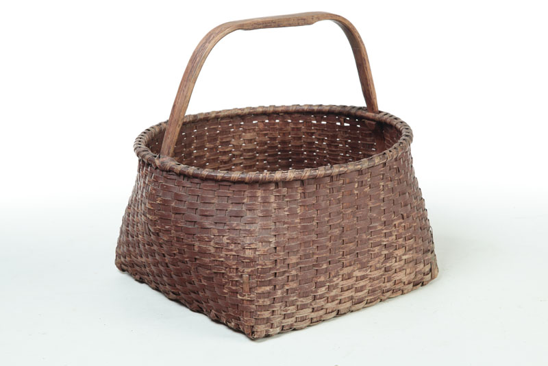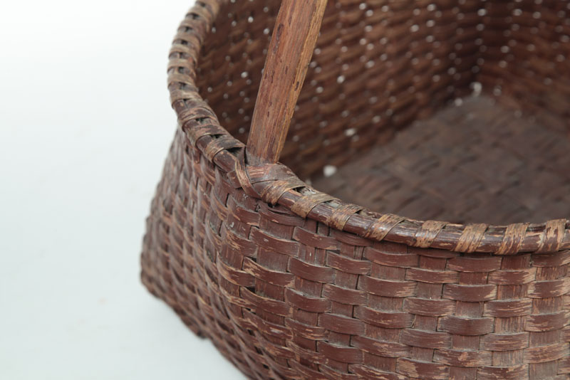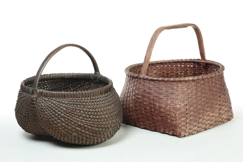 American, late 19th-early 20th century, woven splint. Buttocks basket with dark patina, 8 1/2"h. plus handle, and a gathering basket with worn red paint, 8 1/2"h. plus handle.