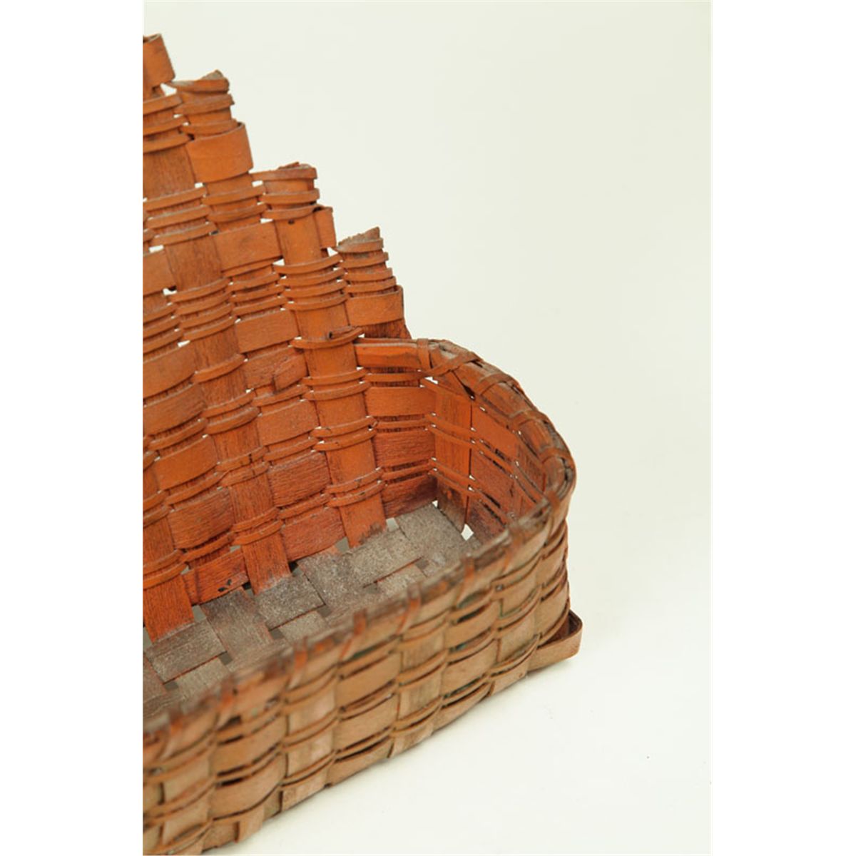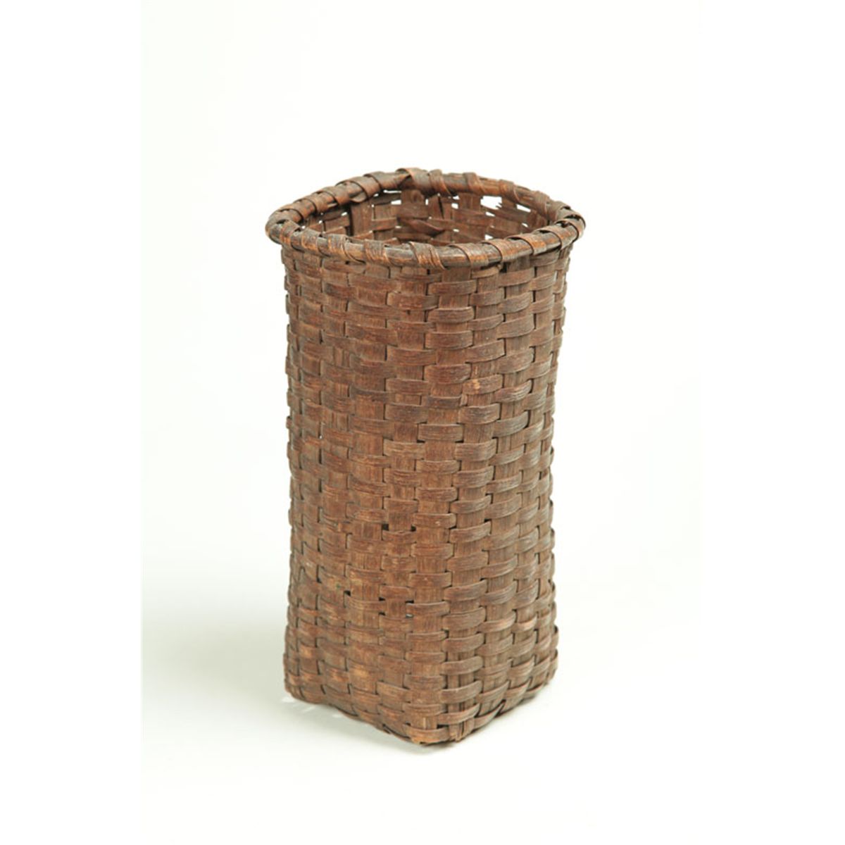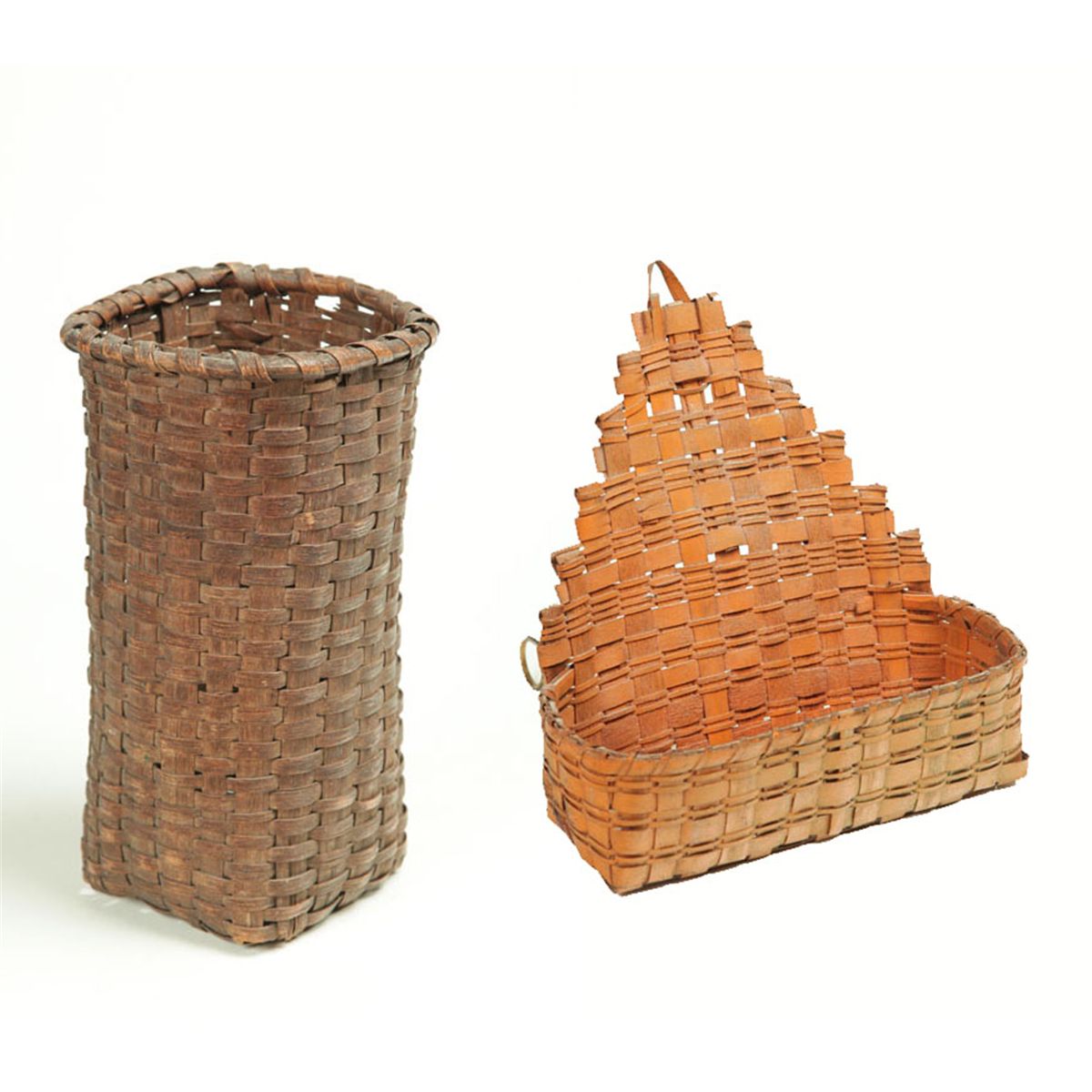 American, 19th century, splint. Triangular back over an oblong compartment, and retaining its original pumpkin orange paint. 10 1/2"h. 10"w. Ex David Good (Ohio). And a square basket with no handle. Great old surface. A few minor breaks. 10 3/4"h.