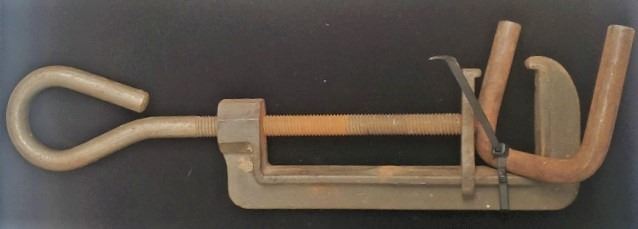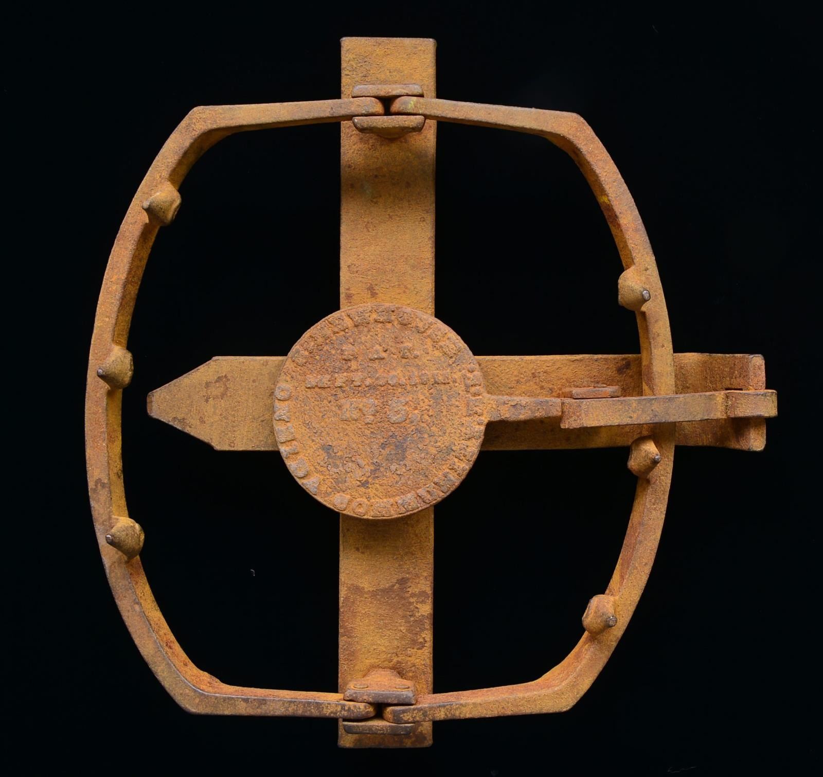 2) ONEIDA COMMUNITY NO. 5 BEAR TRAP. The pan on this No. 5 trap is marked, “NEWHOUSE ONEIDA COMMUNITY N.Y. PAT SEPT. 26-1911 NO. 5”. This marking dates the trap from 1911-1925. The trap does not have its springs present. CONDITION: trap has a reddish oxidized finish throughout. (02-14548/BF). $400-700.