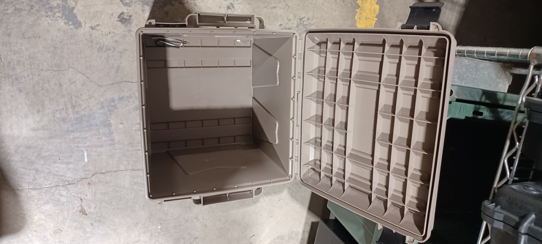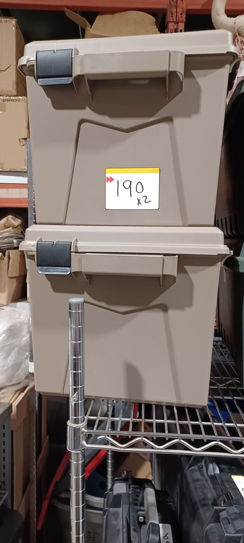 TWO BEIGE STORAGE BOXES 15 X 14 X 13"