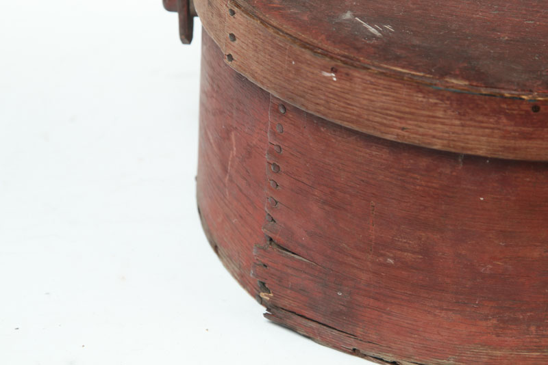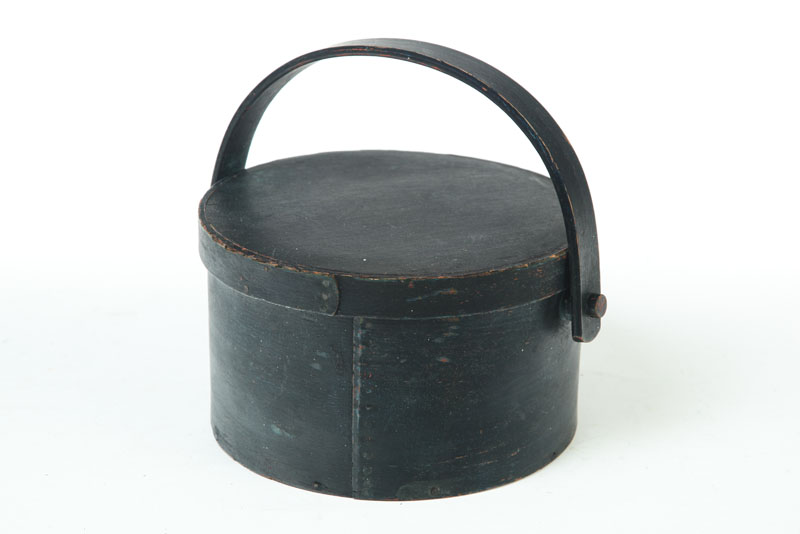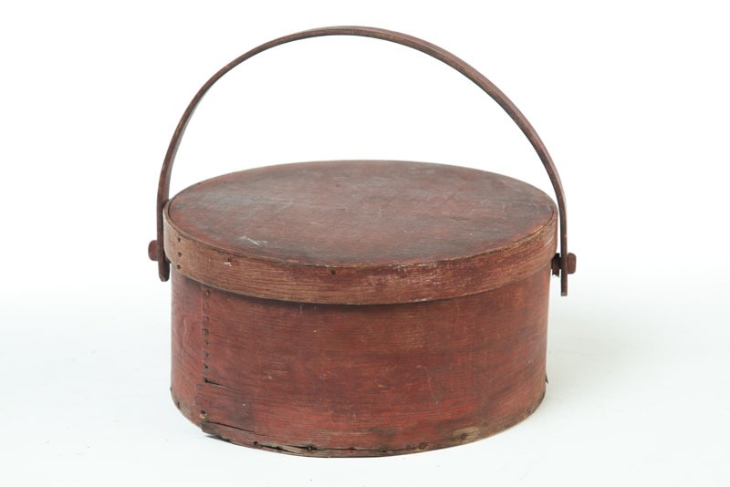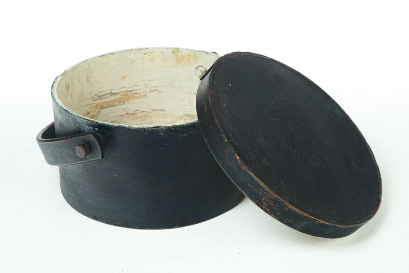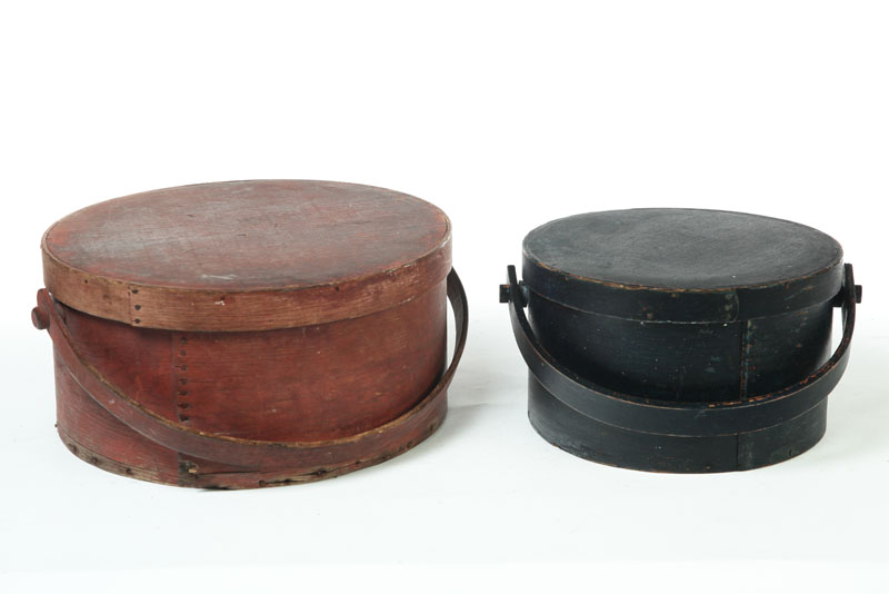 American, late 19th century. Round, lidded carriers with bentwood swing handles and lapped seams with iron tacks. Dark blue repaint, found in Rhode Island, 7"h. 12"d., and original worn salmon, 7 1/4"h. 15"d. Edge damage.