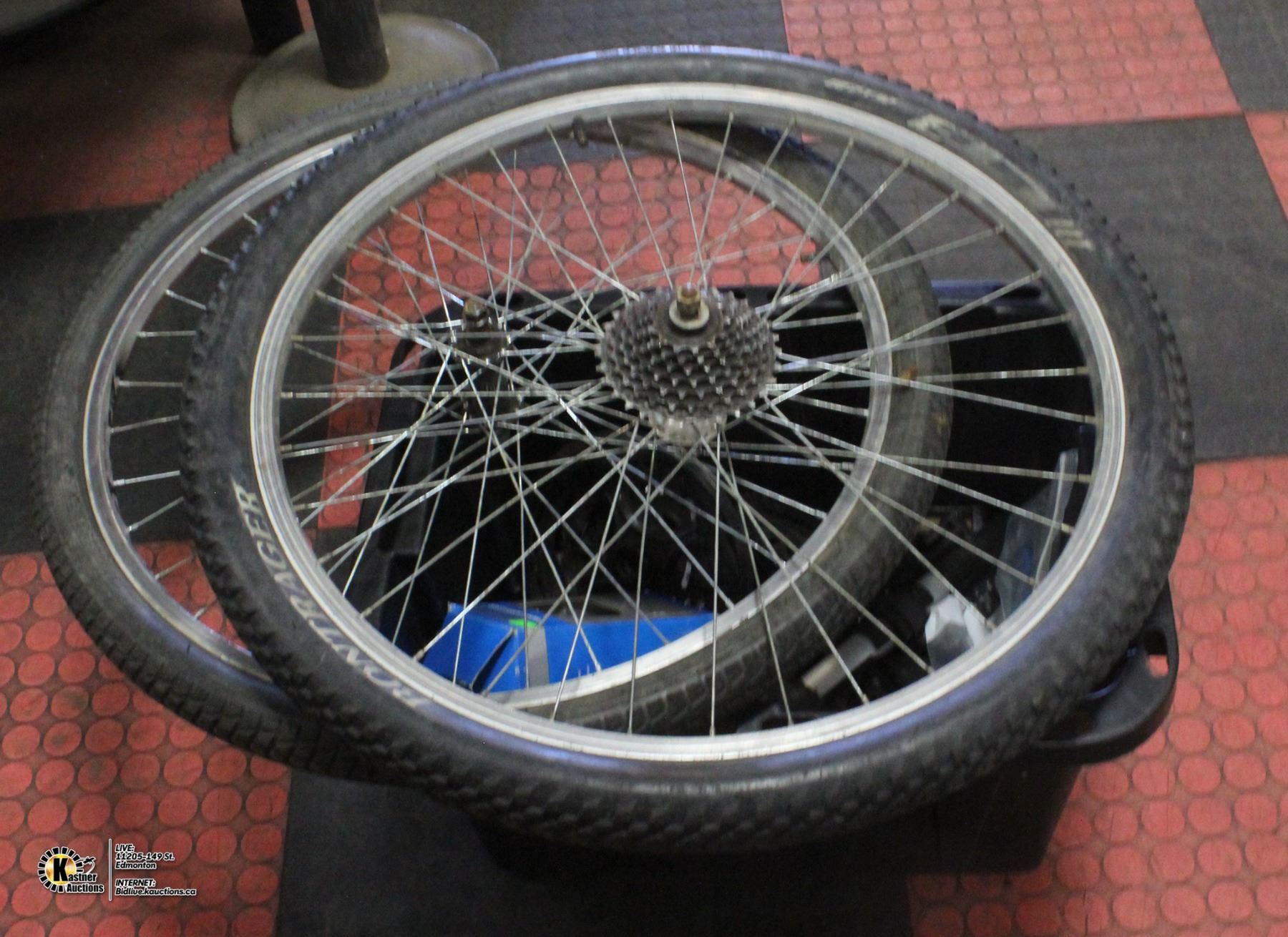 TWO BIKE TIRES/RIMS WITH ASST BIKE PARTS