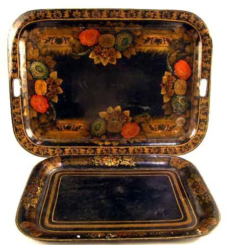 TWO BLACK PAINTED STENCIL AND POLYCHROME DECORATED TOLEWARE TRAYS; Of rectangular form with floral decoration, the smaller signed on the reverse, Edna Adams Peterson, Reading VT (losses and wear) The largest 19"h x 25"w