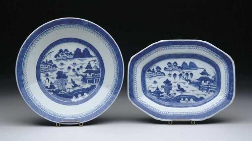 TWO BLUE AND WHITE CANTON PLATTERS. 11-1/2” round platter and an 11-1/2” x 9” cut corner platter. CONDITION: Very good. 9-27468-4