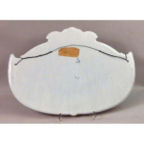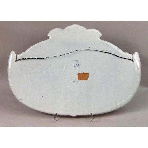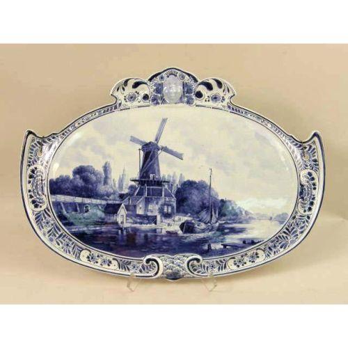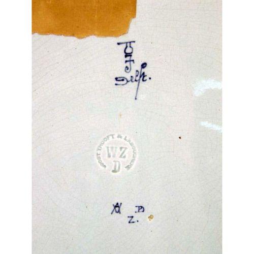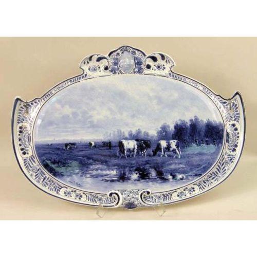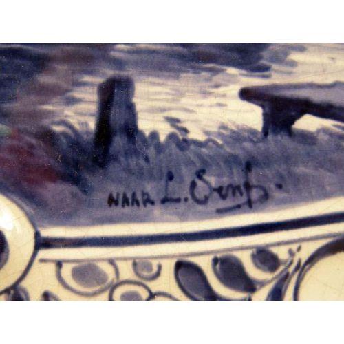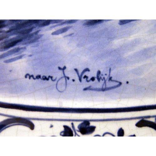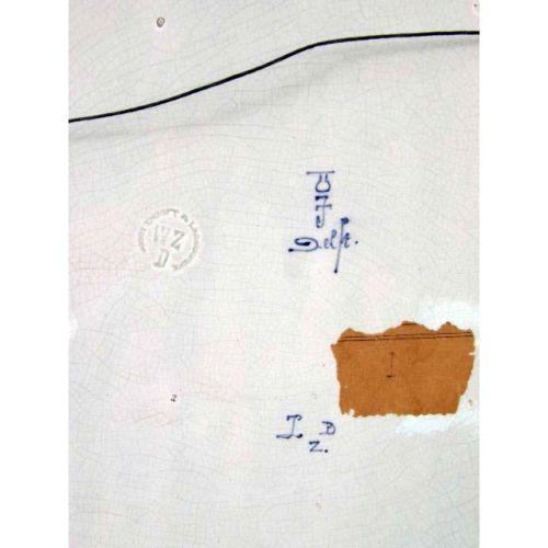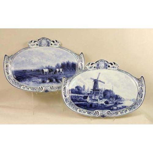 TWO BLUE AND WHITE DELFT WALL PLAQUES<BR><BR>One depicting cows in a meadow, bears signature "Naar F. Vrobyk," the other depicting a canal scene with a windmill, bears signature "Naar L. Ount," both stamped on reverse "Woost Thoout and Labourchere." craquelure, 16"h x 23"w
