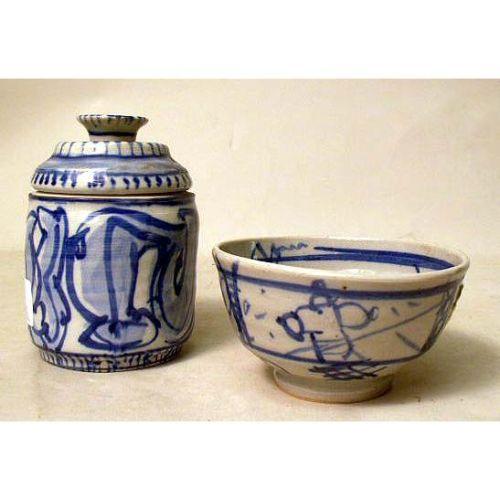 TWO BLUE AND WHITE GLAZED PIECES OF HOLLOWWARE<BR><BR>The covered example probably Arakawa and inscribed on the underside "Made in New Jersey", the bowl probably by Mangus. From 5 3/4" to 5 1/2"h.