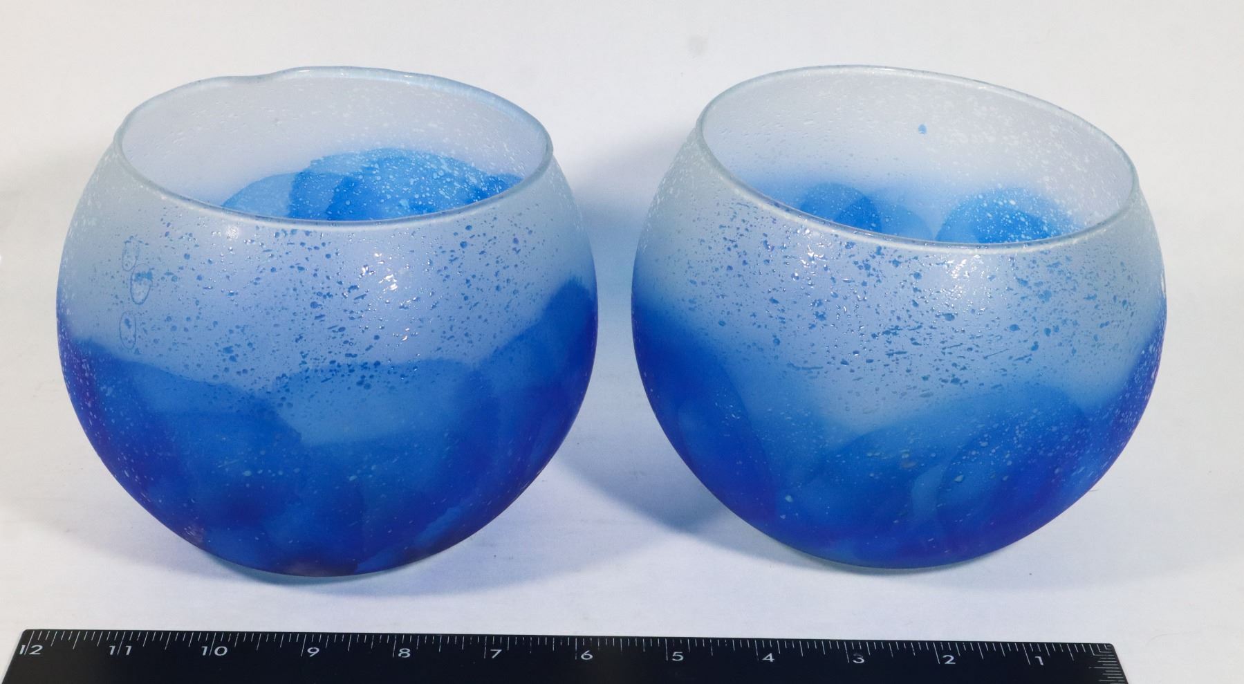 TWO BLUE BARREL GLASS VASE/ CANDLE HOLDERS