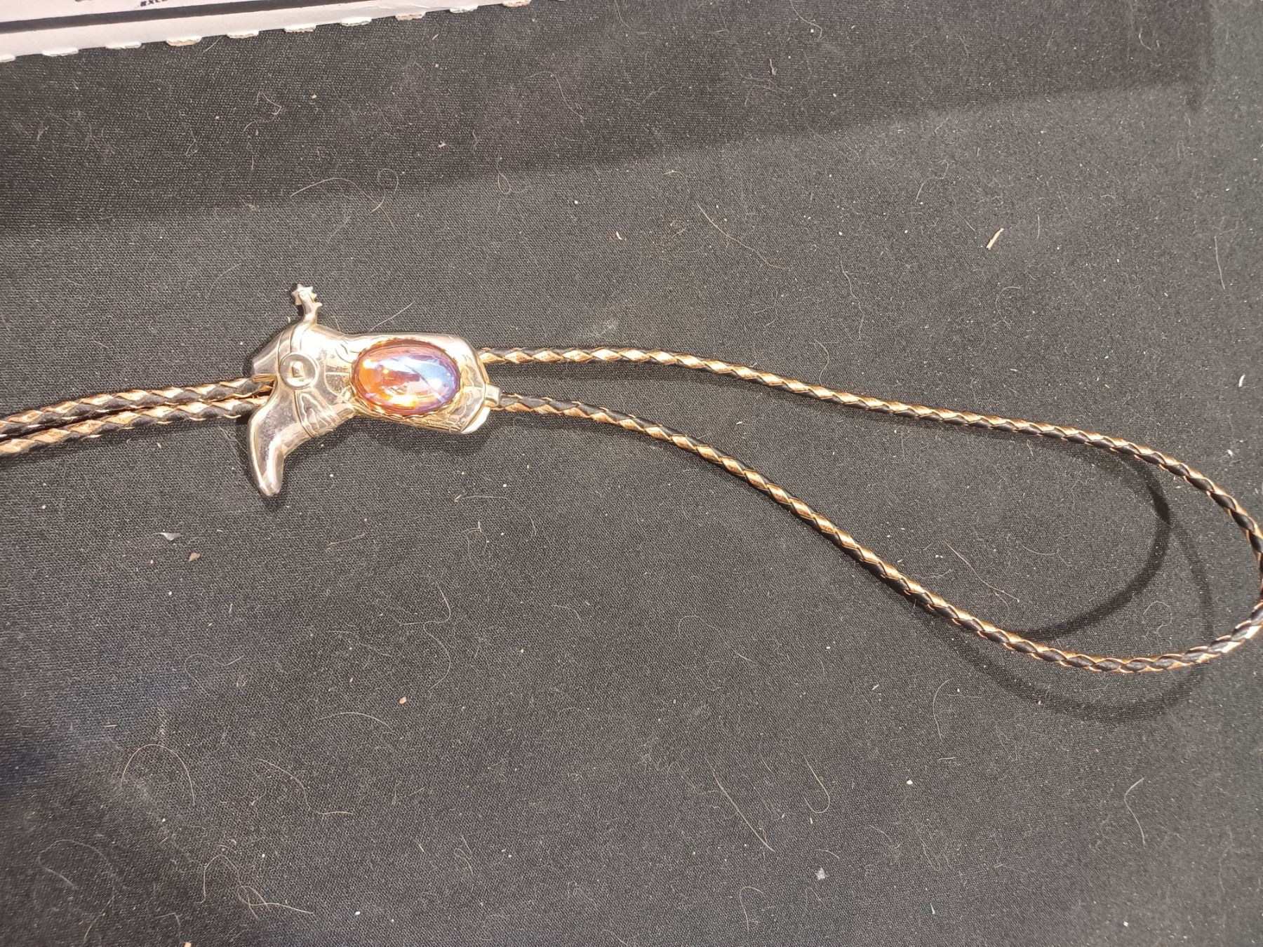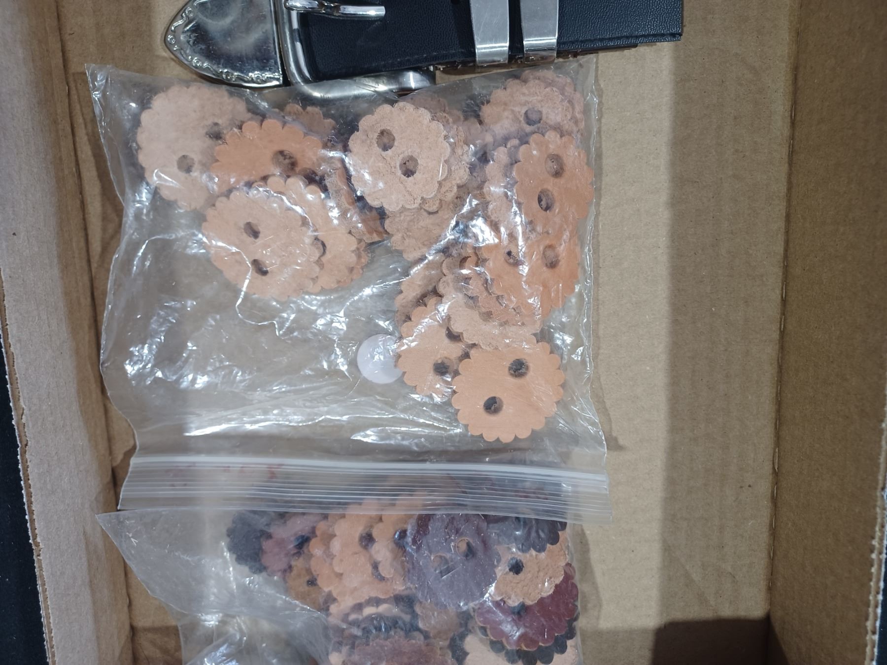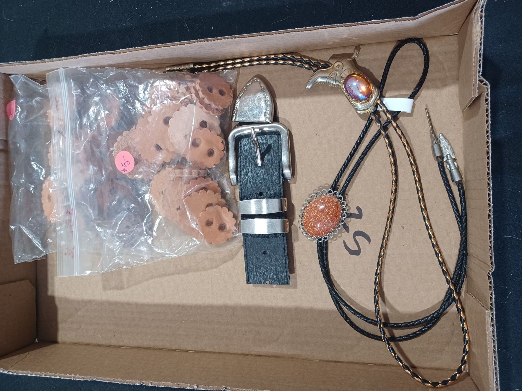TWO BOLO'S, TWO BAGS OF LEATHER PATCHES, BELT - PARTS