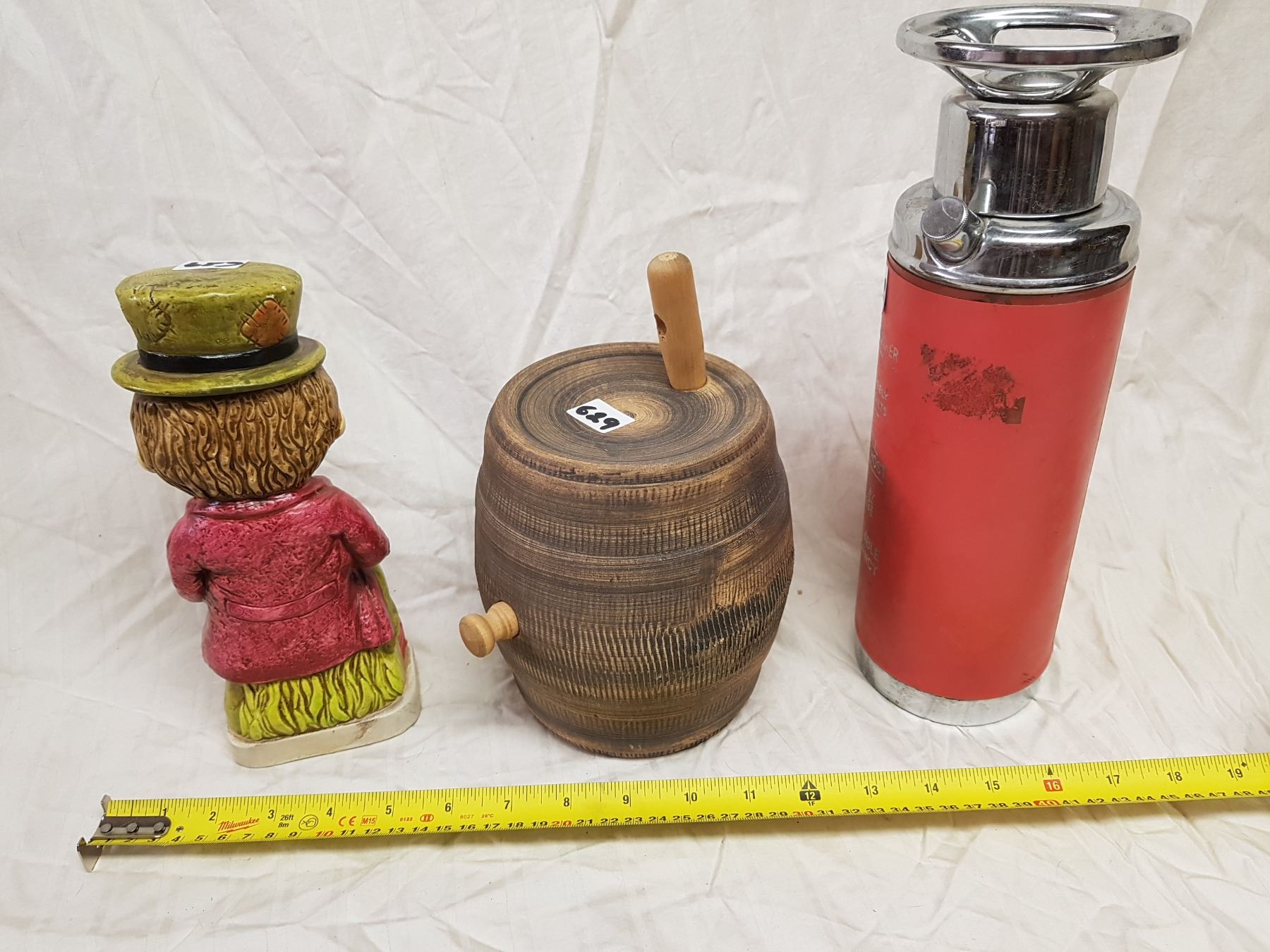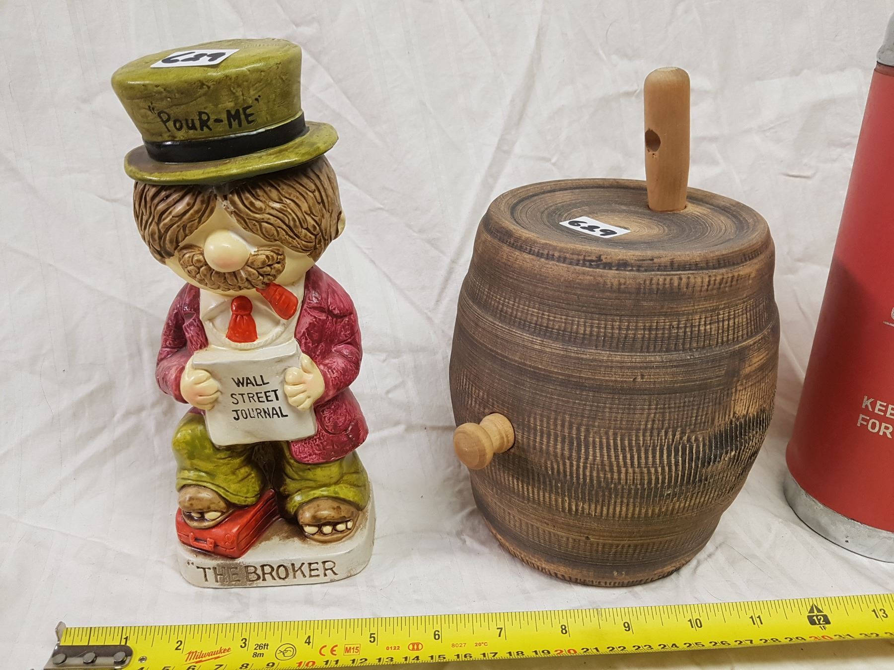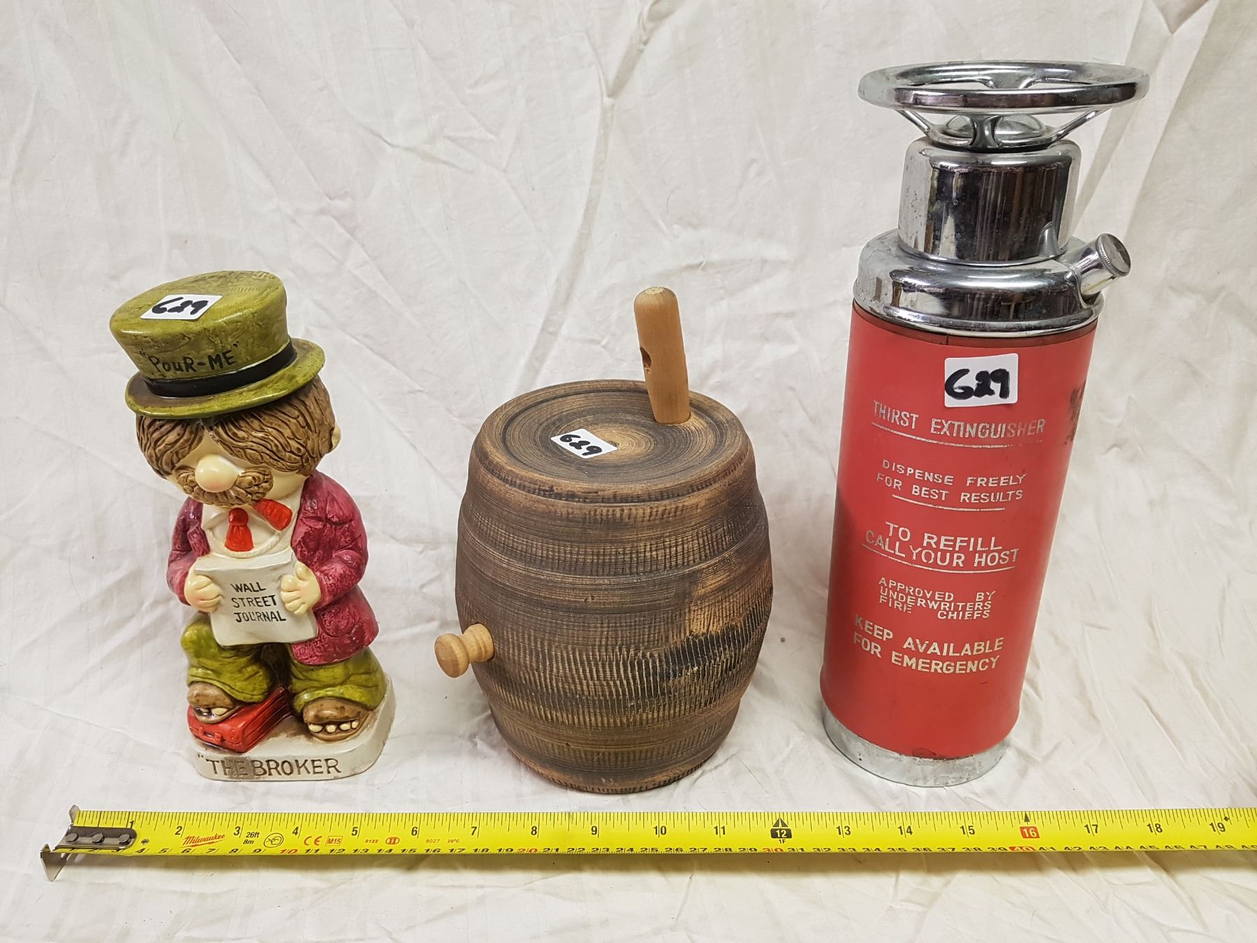 TWO BOTTLES, ONE DECANTER (BARRELL & FIRE EXTINGUISHER SHAPED)