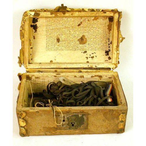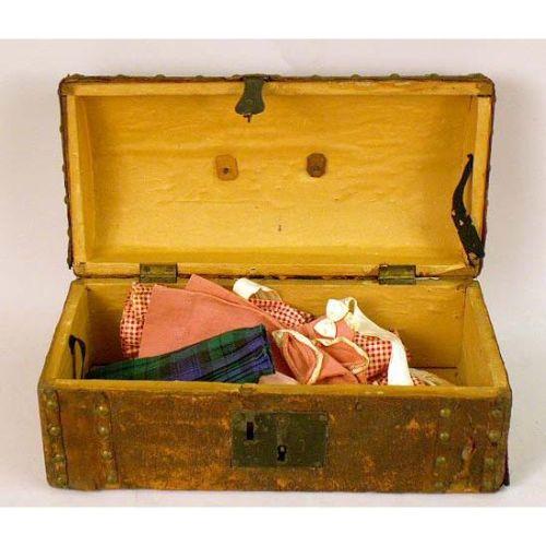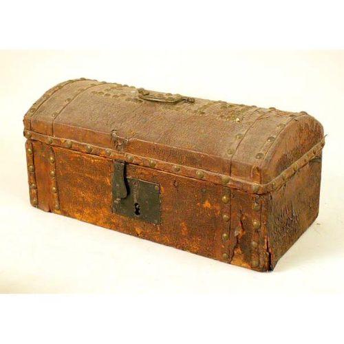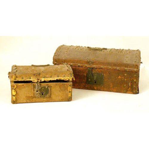 TWO BRASS TACK AND HIDE COVERED DOME-TOP TRINKET TRUNKS<BR><BR>The larger bears brass tack initials "E.A.M." Each in as found condition, distressed, Sizes from: 5"h x 9"w x 5 1/2"d to 6 1/2"h x 14 1/2"w x 7"d