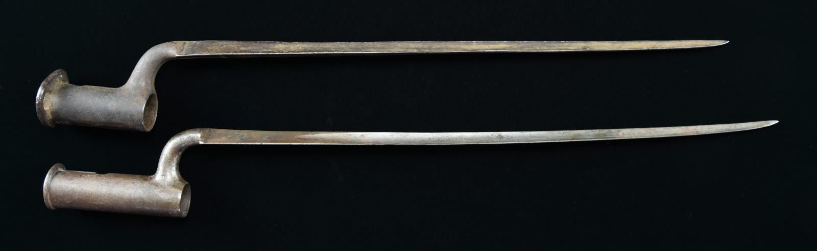 1) 17" Triangular blade socket bayonet w/ L shaped mortise. Bayonet is marked on the top flat "J. Hill" crown over "3" "2". Socket is approx. 7/8" inside diameter & measures 4" in length. CONDITION: bayonet is turning overall gray & patina w/ moderate wear, light oxidation & scattered fine pitting. 2) 16" Triangular blade socket bayonet. Resembles the British pattern 1839. The top of the blade & top of socket have Nepalese markings & engraving. The socket is approx. 3" in length & has a bore of nearly 1". CONDITION: bayonet has turned overall gray & patina w/ wear & areas of light oxidation plus shallow pitting. (02-19611-11/RW). $100-200.