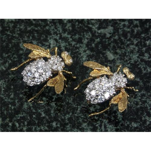 BROOCHES: Two (2) matched 18 karat yellow gold and diamond "bee" form brooches. Each of these brooches include: Twenty-one (21) prong and bezel set round brilliant cut diamonds weighing approximately 1.32 carat total weight (by weight estimation formula,) for a total of 2.64 carat total weight (by weight estimation formula.) Appraisal included. 7751-c01