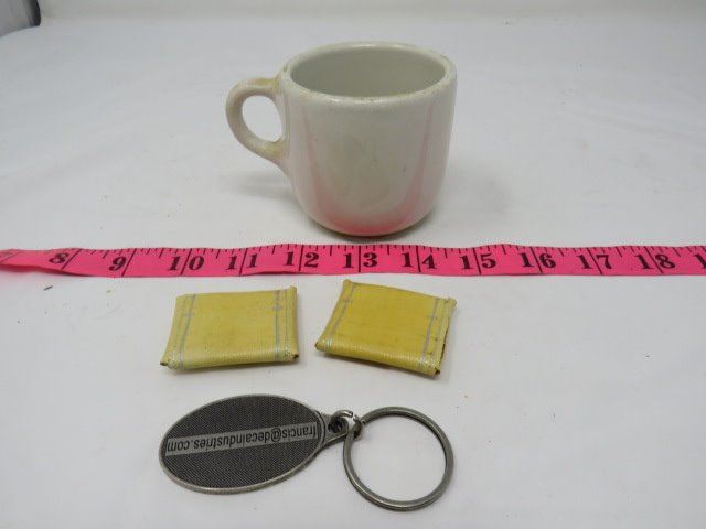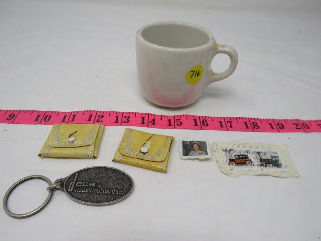 TWO BUTTON CASES, SHAVING MUG, STAMPS, KEY CHAIN
