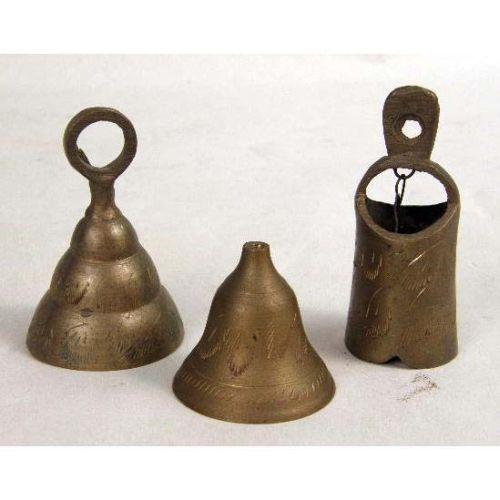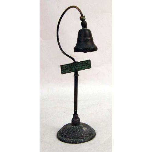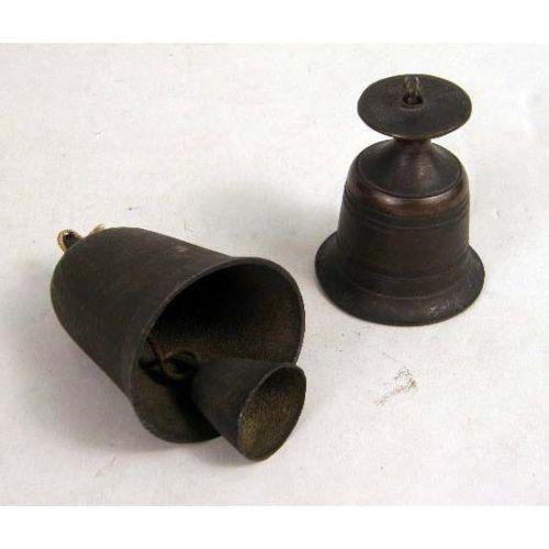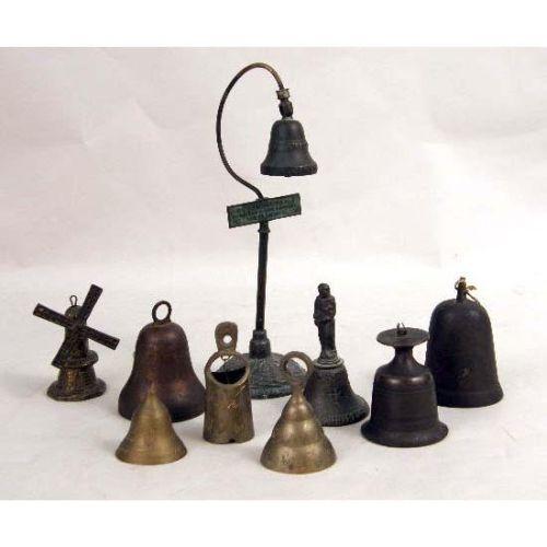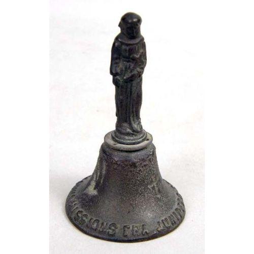 TWO CALIFORNIA MISSION BELLS<BR><BR>one a miniature representation of the "Camino Real" bell, the other a small figural handbell depicting Father Junipero Serra. Together with seven assorted miscellaneous bells, most missing their clappers. Heights from 2" - 10". 9 pieces.