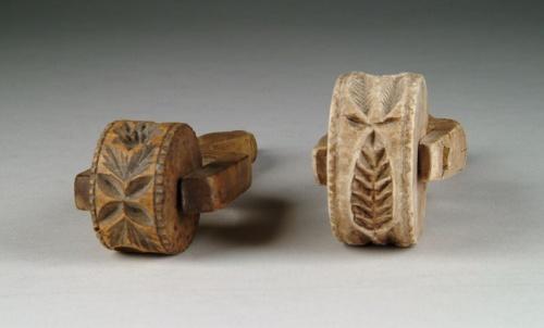 TWO CARVED WOOD BUTTER PRINT ROLLERS. 1) 5-1/2in. l having 2-1/4in. dia wheel. The wheel carved with different leaf designs. Remnants of a red wash. CONDITION: Crack in wheel, otherwise very good. 2) 6-1/2in. l having 1-3/4in. dia wheel with differing flowers and cherry motif. The roller frame nicely carved and turned with decorative finial. CONDITION: Very good. 9-25393