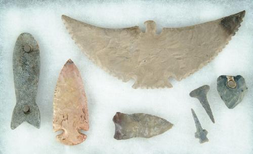 TWO CASES OF GOOD AND REPRODUCTION POINTS. Includes several nice drills, late Paleo Indian Hardaway point. New artifacts include eccentrics and thunderbird. CONDITION: Generally good. 9-25984-106 The Tennessee Collection of Prehistoric Indian Artifacts from the Allen Graves Estate. SPECIAL NOTE: We do not regularly sell Prehistoric Indian stone artifacts and therefore have very little experience and no expertise in this area. All of the following lots have come from the Collection of the Late Allen Graves of Tennessee. The collection was inherited some years back by his daughter, who now lives in Maine. This collection was consigned to us directly from her. We employed someone to generally identify styles and types, but as stated above, due to our lack of expertise in this field, we can not guarantee the age or origin of the following pieces. We are relying on you, the buyer, to determine to your satisfaction the origin and age of each item in the collection.