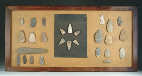 TWO CASES OF INDIAN ARTIFACTS. 1) Ranging from Paleo Indian to Middle Woodland, Circa 10000BC style-750AD style. Includes Calf Creek, Adena, Kirk and dovetail types. 2) Large preforms, choppers and knives, some marked Tennessee. CONDITION: Broken to very good. 9-25984-100 The Tennessee Collection of Prehistoric Indian Artifacts from the Allen Graves Estate. SPECIAL NOTE: We do not regularly sell Prehistoric Indian stone artifacts and therefore have very little experience and no expertise in this area. All of the following lots have come from the Collection of the Late Allen Graves of Tennessee. The collection was inherited some years back by his daughter, who now lives in Maine. This collection was consigned to us directly from her. We employed someone to generally identify styles and types, but as stated above, due to our lack of expertise in this field, we can not guarantee the age or origin of the following pieces. We are relying on you, the buyer, to determine to your satisfaction the origin and age of each item in the collection.