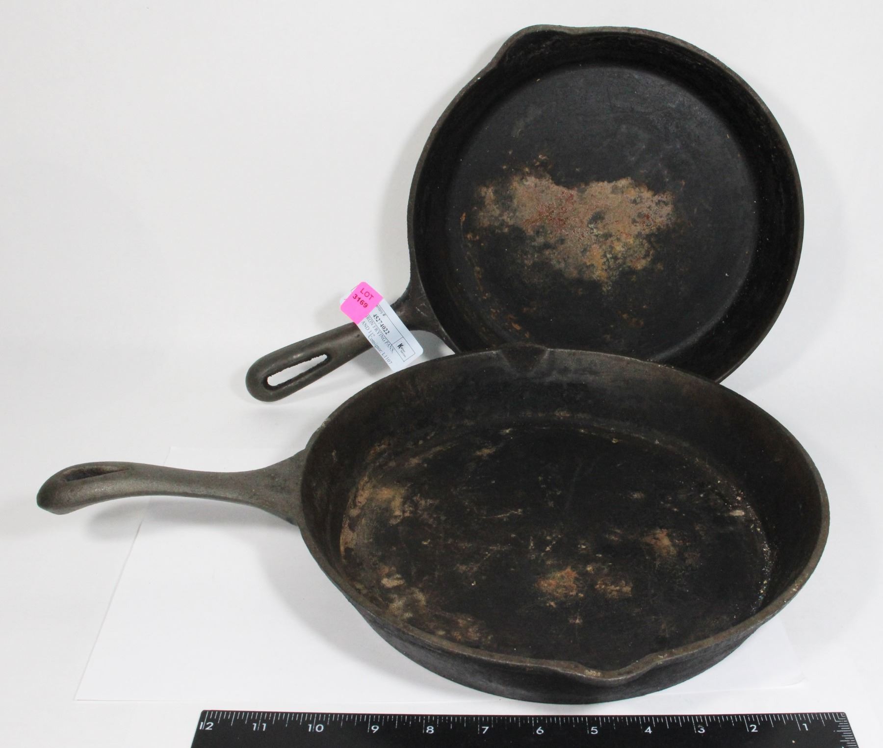 TWO CAST IRON FRYING PANS, APPROX 10" AND 11"