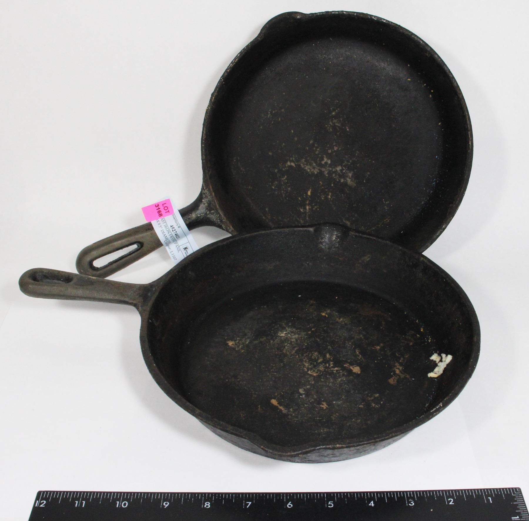 TWO CAST IRON FRYING PANS, APPROX 9.5" DIAMETER