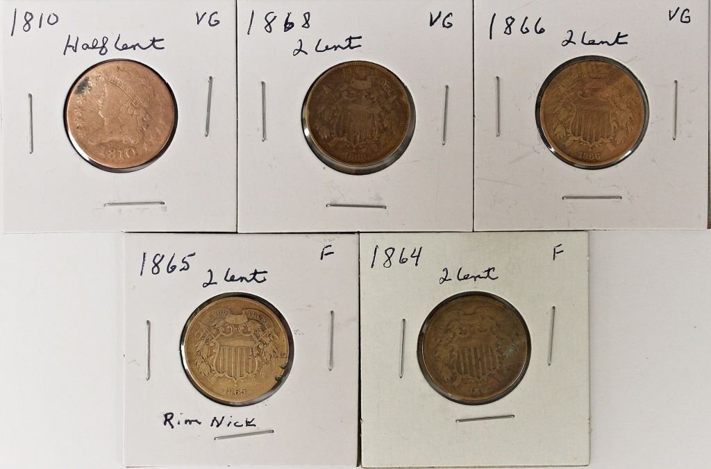 1864 F, 1865 F RIM NICK, 1866 VG, AND 1868 VG. AND 1810 HALF CENT VG. ESTIMATE: $85-$110
