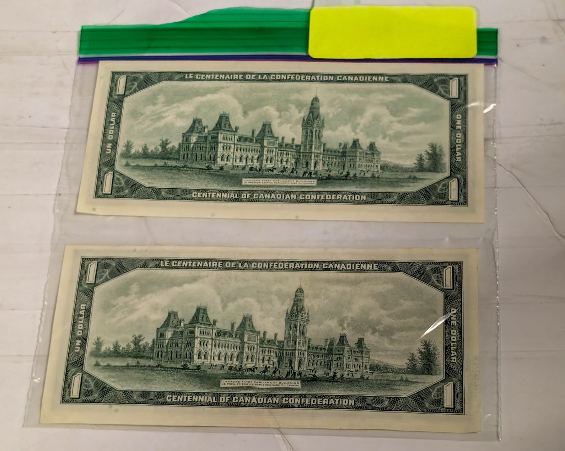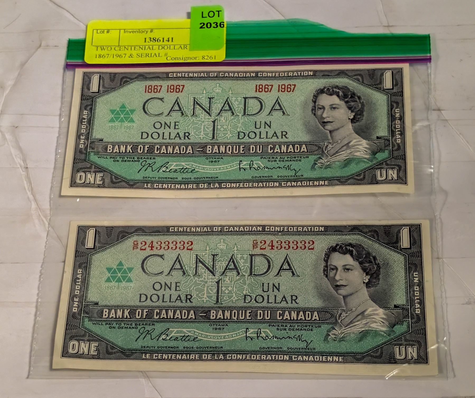TWO CENTENIAL DOLLAR BILLS: 1867/1967 & SERIAL #
