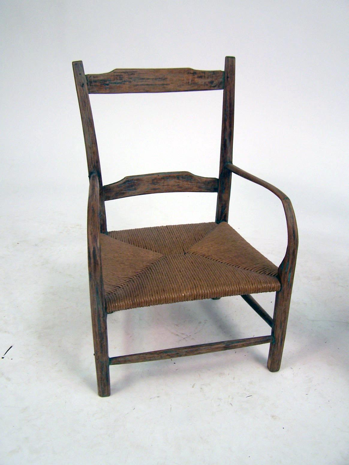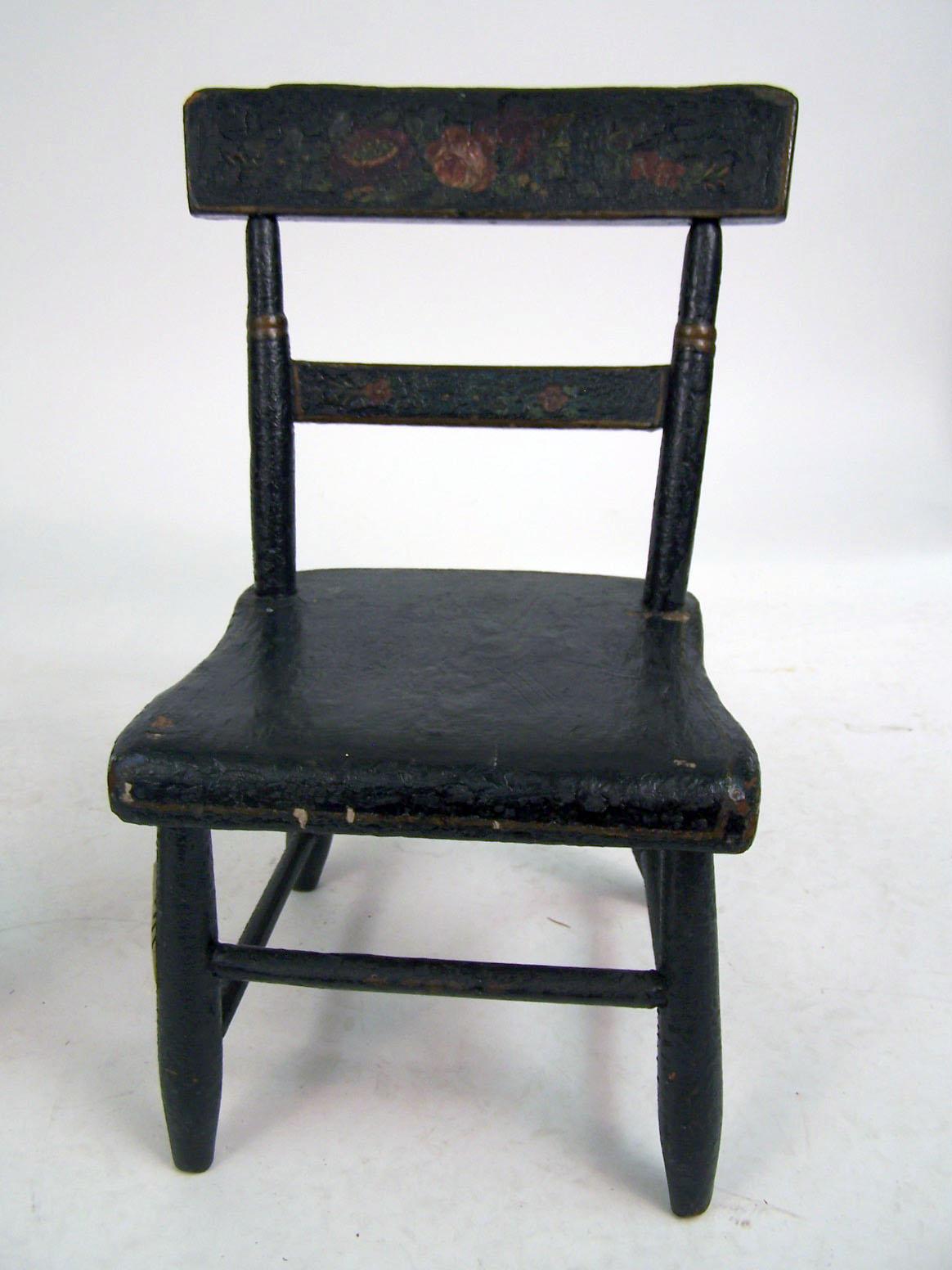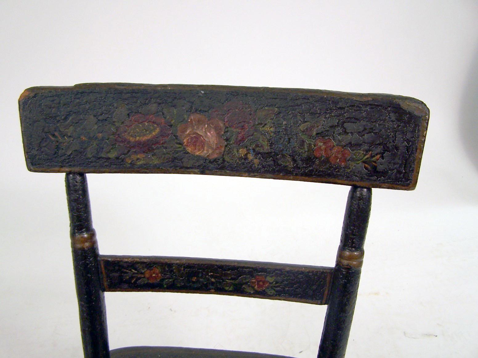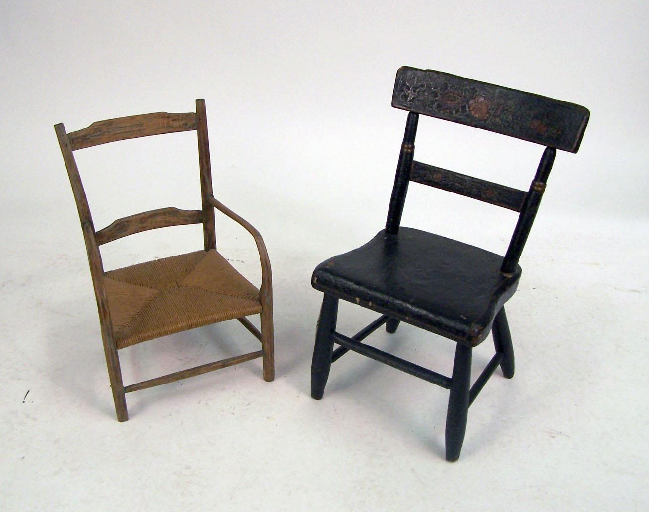 American, comprising a blue-painted armchair, and a black-painted side chair. From 19 1/2"h to 22 1/2"h