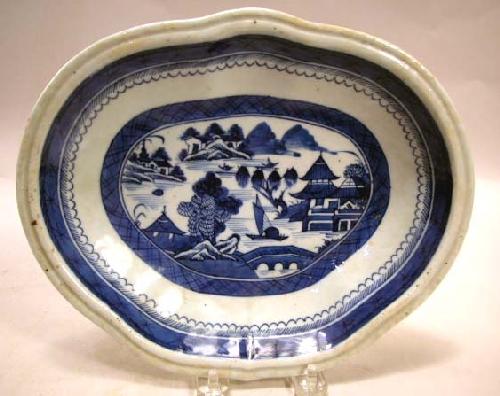 TWO CHINESE EXPORT PORCELAIN OBLONG DISHES; Canton pattern, with shaped sides and conforming foot 10 1/2"w