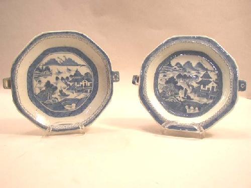 TWO CHINESE EXPORT PORCELAIN OCTAGONAL WARMING DISHES; Canton pattern 10"w (minor chips)