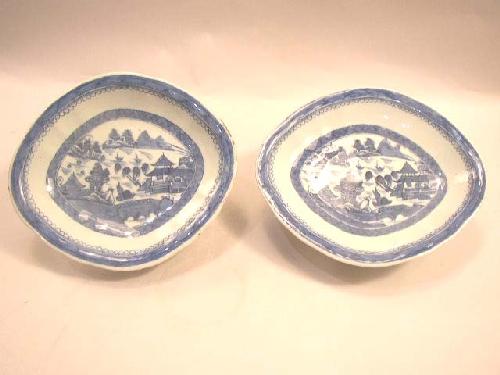 TWO CHINESE EXPORT PORCELAIN OVAL SHALLOW DISHES; Canton pattern, each with wavy rim 10"l (minor losses)