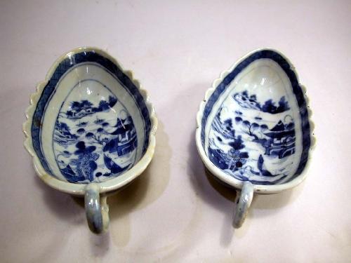 TWO CHINESE EXPORT PORCELAIN OVOID SHALLOW GRAVY BOATS; Canton pattern, each with spurred loop handle and scalloped sides, (one with imperfections, small chip and hairline), 7-3/4"l