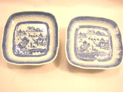 TWO CHINESE EXPORT PORCELAIN SQUARE SHALLOW BOWLS; Canton pattern 8 1/2"w