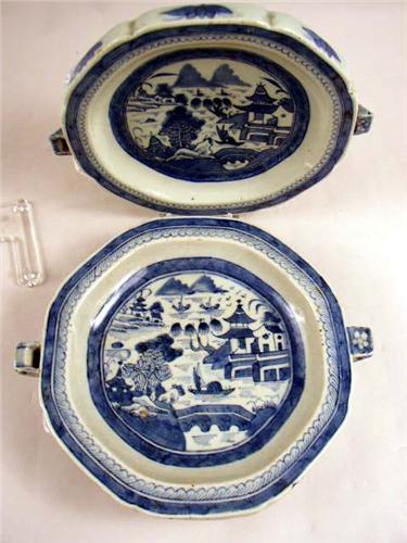 TWO CHINESE EXPORT PORCELAIN VEGETABKE WARMING DISHES; Canton pattern, each of a shaped circular form with pierced projecting handles, 10 3/4"l