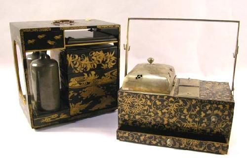 TWO CHINESE LACQUER TRAVELING BOXES; Largest 10-1/2"h