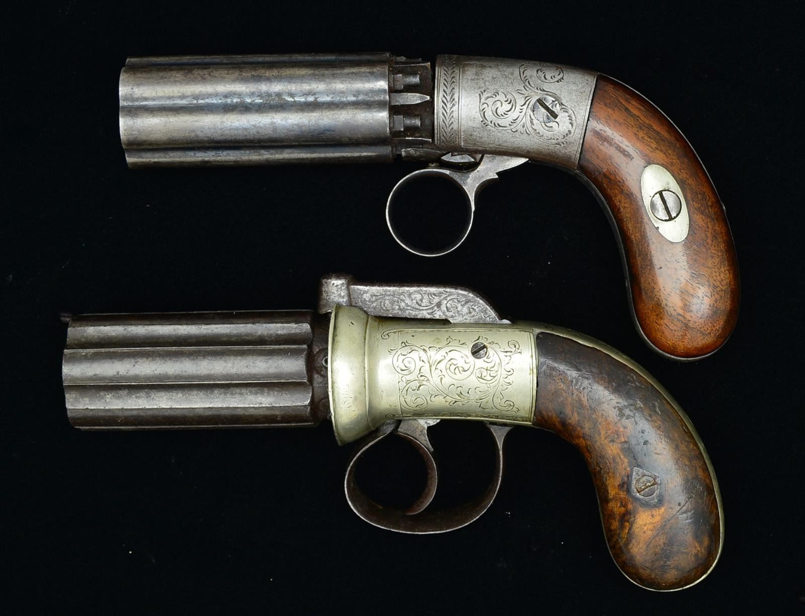 1) Cal. 31. NSN. Bbl. 3" 6-bbl. cluster. 7" overall. Ring trigger. Engraved steel frame marked “BLUNT & SYMS / NEW YORK”. CONDITION: fine overall, bbls. retain about 30% blued finish. Frame is smooth gray steel w/ crisp engraving, agent marking is discernible though bottom half of New York was only partially struck. Mechanically fine w/ clear bores. 2) Cal. 31. NSN. Bbl. 2 3/4" 6-bbl. cluster w/ English proofs on each rib between bbls. 7.25" overall. Engraved German silver frame w/ integral shroud protecting nipples. Dbl. action w/ bar hammer. CONDITION: good to very good overall. Bbl., hammer, trigger & trigger guard have iron patina w/ pitting. German silver frame has silvered patina. Burl grips have numerous sm. dings & dents w/ lg. hairline on right side. Mechanically functional w/ clear dark bores. PROVENANCE: The Estate Collection of Gary Parietti. (01-19267/JS). BOTH ANTIQUE. $700-900.