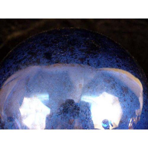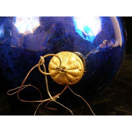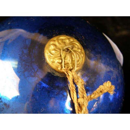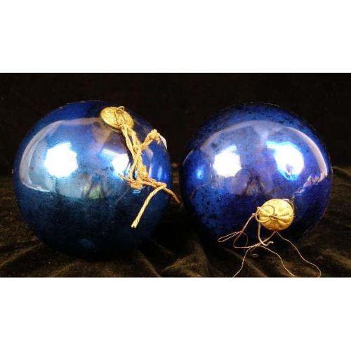 TWO COBALT BLUE KUGEL CHRISTMAS ORNAMENTS<BR><BR>With embossed brass caps, some discoloration, 4 3/4"dia.