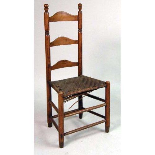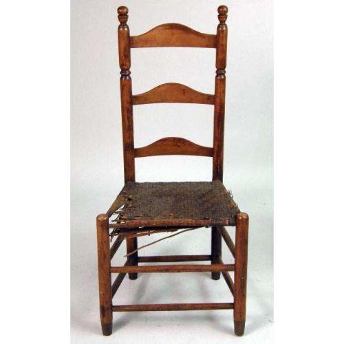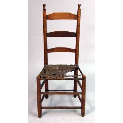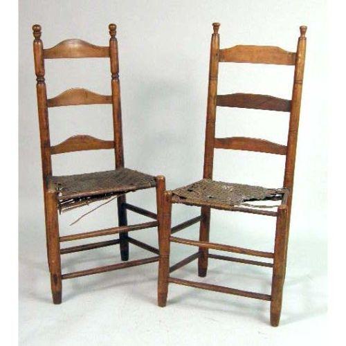 TWO COLONIAL-REVIVAL RUSH-SEAT LADDERBACK SIDE CHAIRS<BR><BR>each 39 3/4" h x 14" w x 12 1/2" d. Both with extensive damage to rush seating.