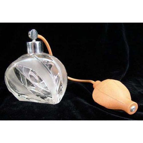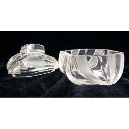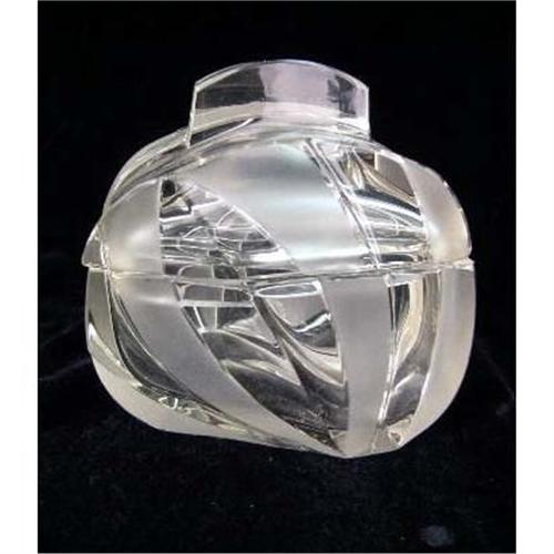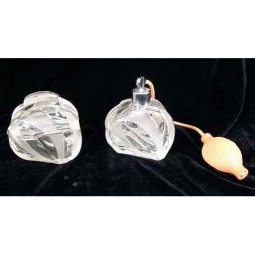 TWO COLORLESS AND FROSTED GLASS ART DECO STYLE DRESSER ITEMS<BR><BR>Purchased in Czechoslovakia, comprising an atomizer and a covered jar, chips