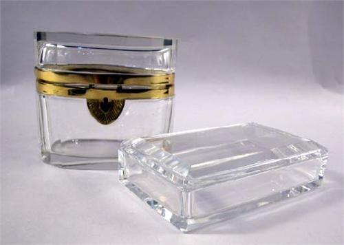 TWO COLORLESS GLASS COVERED BOXES; Comprising: a rectangular Val St. Lambert, 6-1/4"l, and one oval form brass mounted with hinged lid