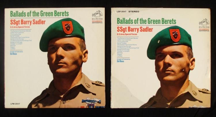 HERE ARE TWO COPIES OF "BALLADS OF THE GREEN BERETS." ON THE COVER IS SSGT BARY SADLER, US ARMY SPECIAL FORCES. IT WAS MADE DURING THE VIETNAM ERA AND IS ARRANGED AND CONDUCTED BY SID BASS. THE RECORD IS FROM RCA VICTOR DYNAGROOVE RECORDING, IS FROM 1966 AND IS IN VERY GOOD CONDITION. * * * *
