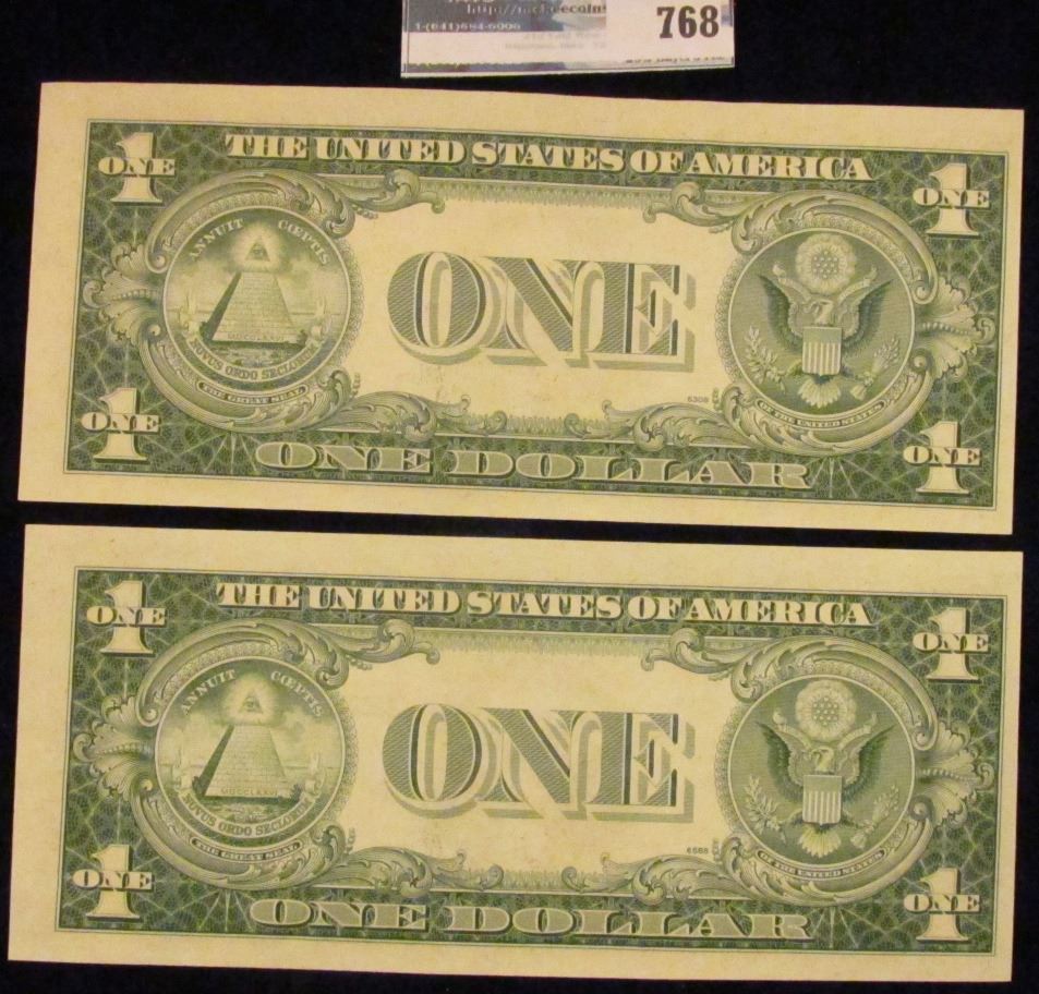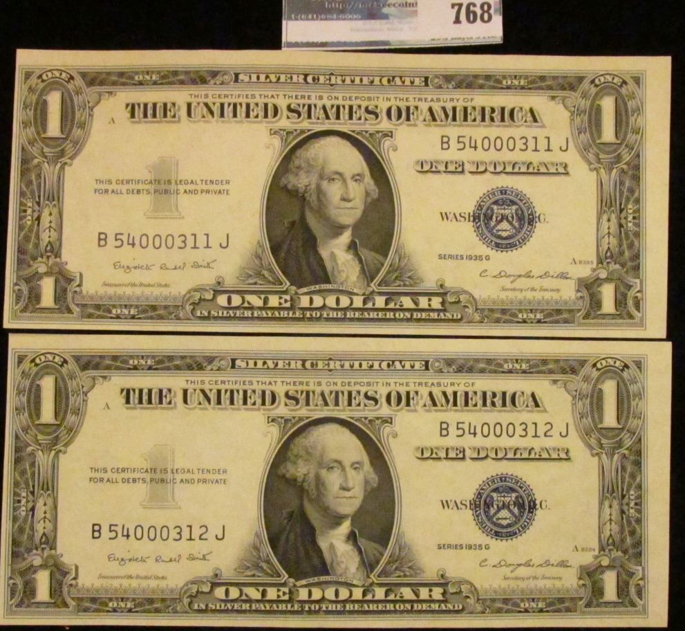 TWO CRISP AND CONSECUTIVE ONE DOLLAR BLUE SEAL SILVER CERTIFICATE SERIES 1935-G. BOTH NOTES ARE WAY OFF CENTER