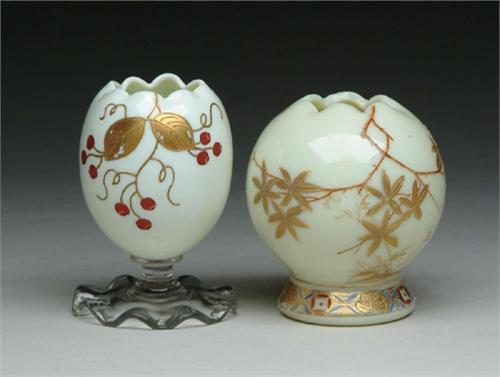 TWO CUSTARD GLASS ROSE BOWLS. Lot consists of a custard glass rose bowl with an applied crystal foot and enamel decoration of berries and leaves. Signed on base with spider web signature, attributed to Webb. The second is a footed custard glass rose bowl with enamel decoration of leaves and branches. Faint propeller signature in the pontil. SIZE: 4 in. and 3-1/2 in. respectively. CONDITION: The second custard rose bowl has a chip to rim, otherwise very good to excellent. Collection of Johanna and Sean Billings 5-60851, 5-60910
