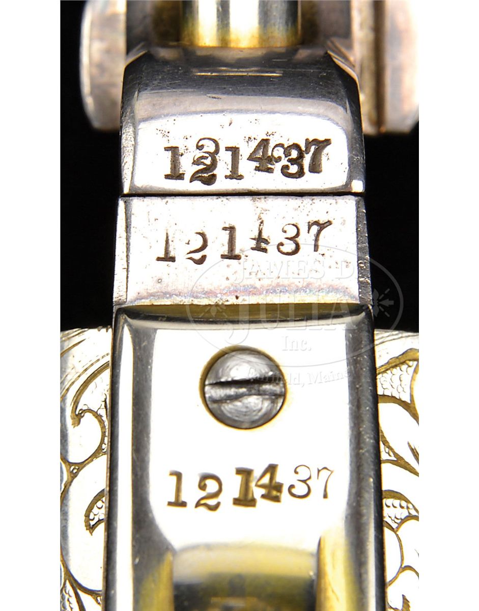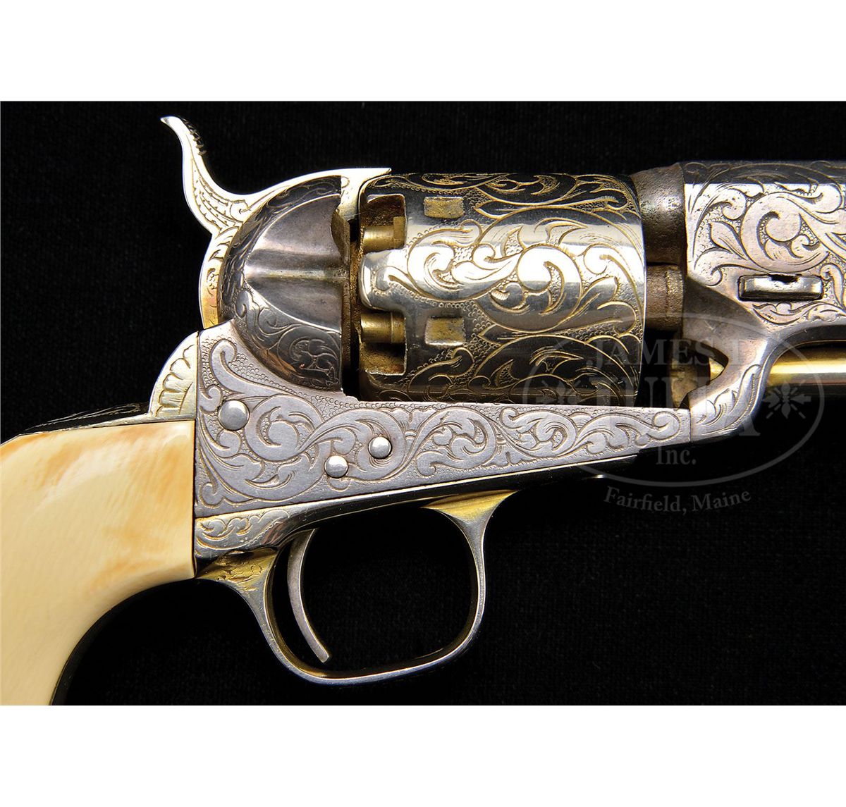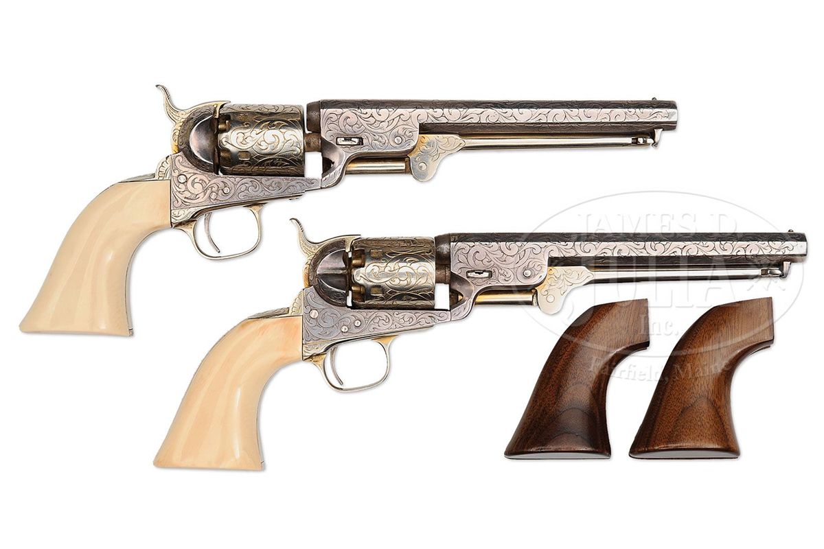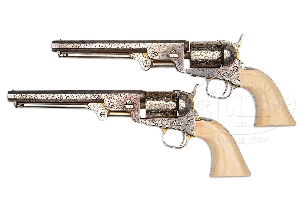 SN 101989 & 121437. Cal 36. Revolvers are virtually identical with nickel and gold finish, 7 1/2" oct bbls, pin front sights and one line New-York U.S. America addresses. Left side of the frames are marked with a small "COLTS PATENT". Rammers, cylinders, hammers and trigger guards were gold washed and revolvers are mounted with beautiful, custom, 1-pc ivory grips. They are accompanied by 2 fine custom 1-pc walnut grips. Revolvers have full coverage flat foliate arabesque engraving with pearled background. Frames, bbls, cylinders, backstraps, buttstraps, trigger guards and rammer pivots are all matching engraving. Hammers are engraved with wolf's heads on each side of hammer noses. It seems likely that these revolvers were custom built for a stage performer or Wild West show performer, probably someone re-enacting the life Wild Bill Hickok who was known to have carried a pair of Colt 51 Navy revolvers. CONDITION: Very good, as custom finished. Overall retain most of their orig nickel finish with traces of gold wash on the aforementioned areas. Ivory grips are extremely fine with sharp edges and wonderful ivory patina. Wood grips are fine and retain about all of their orig varnish. Mechanics are fine although one hammer spring is a little weak. Number 121437 has been bored smooth while the other has a strong bore with scattered pitting. 4-48621 JR39