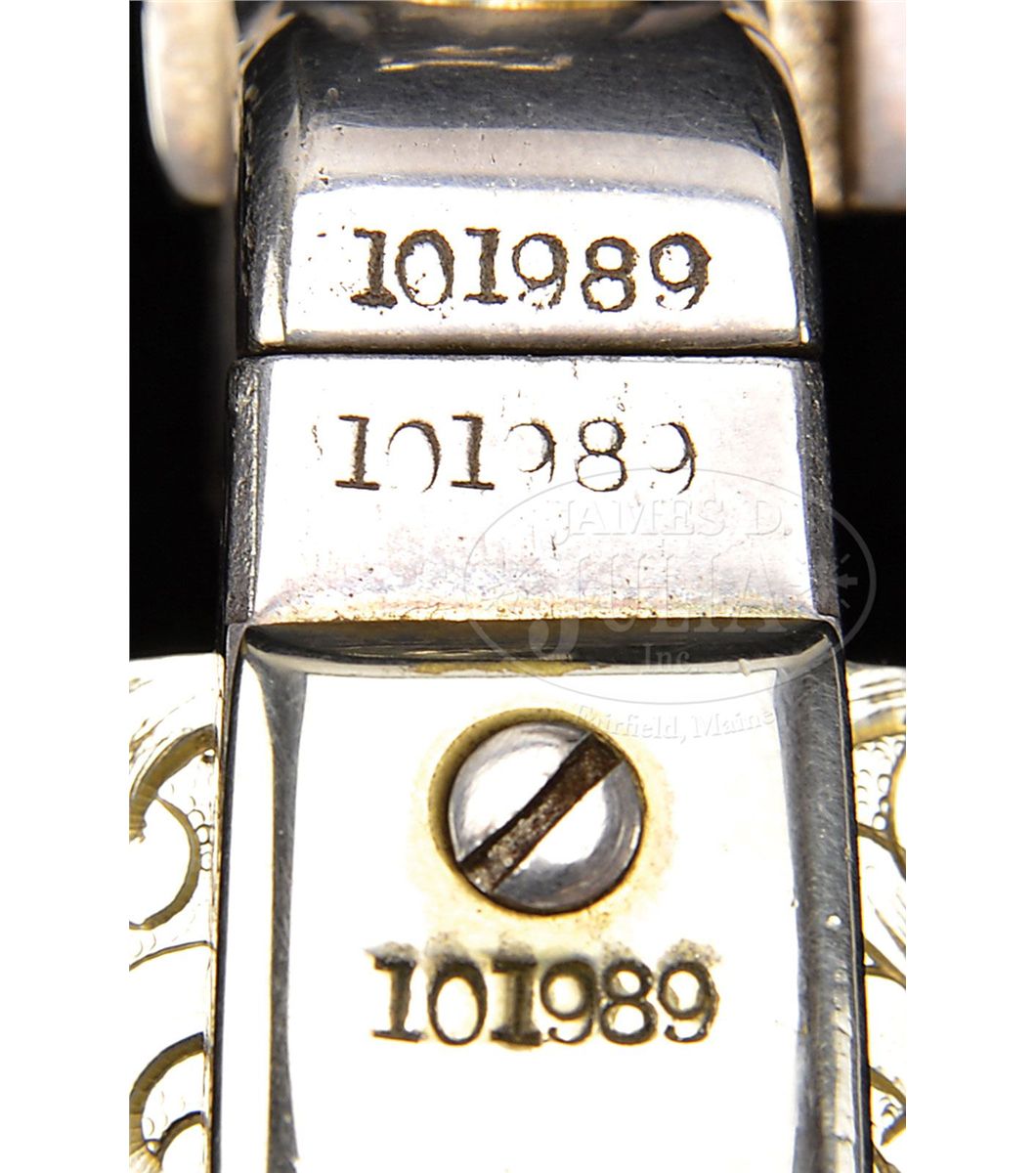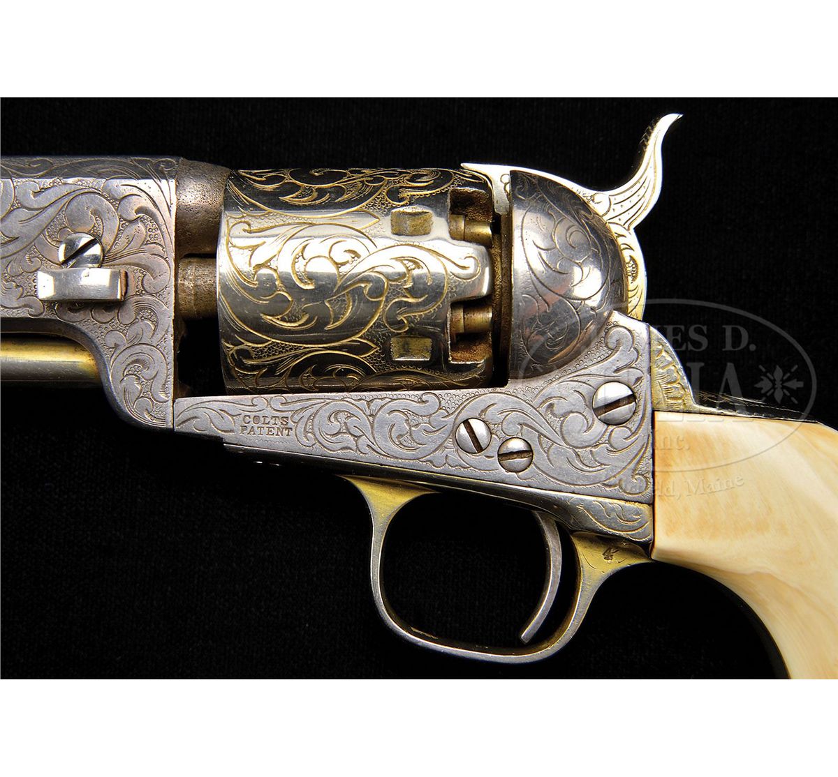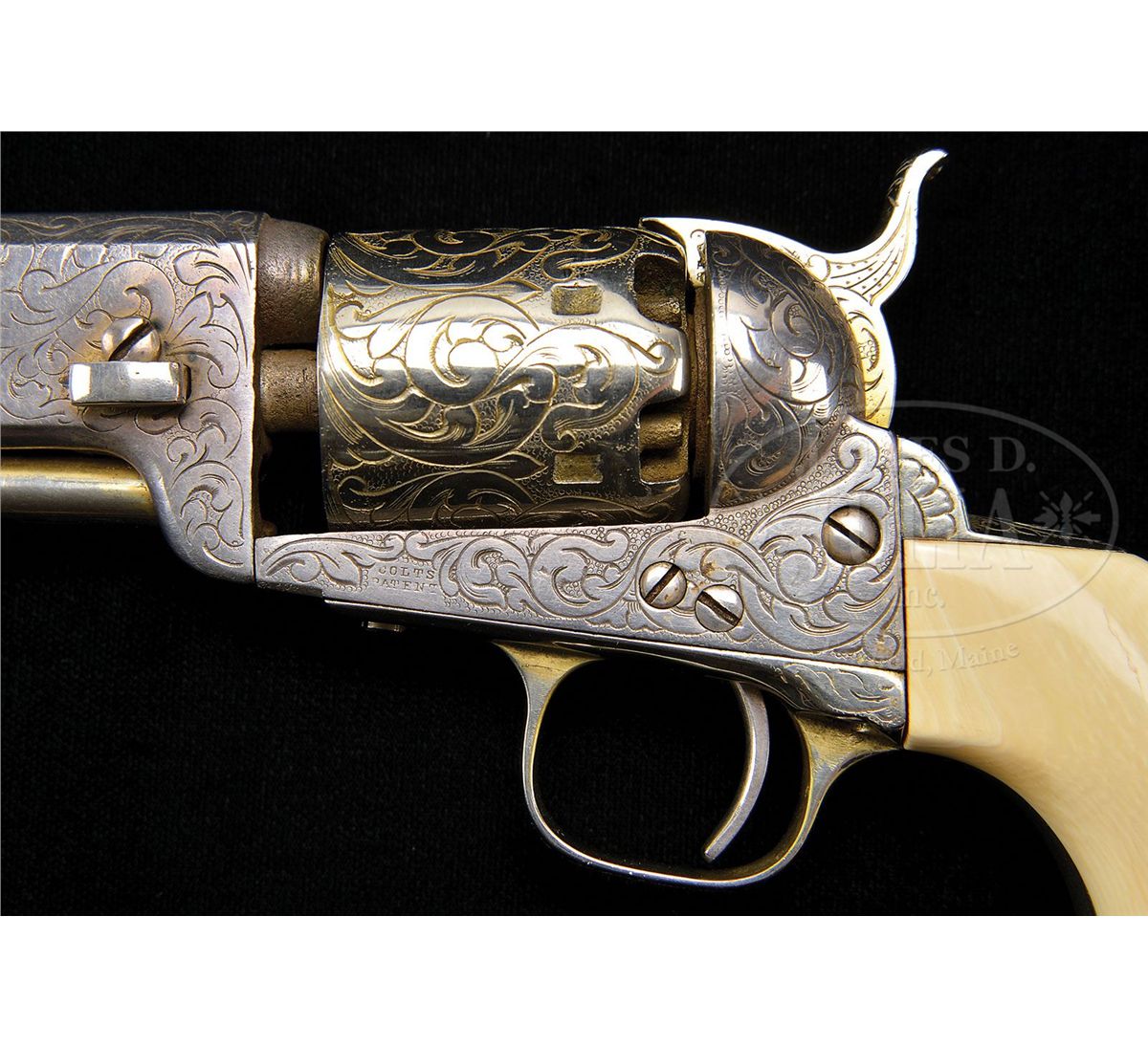 SN 101989 & 121437. Cal 36. Revolvers are virtually identical with nickel and gold finish, 7 1/2" oct bbls, pin front sights and one line New-York U.S. America addresses. Left side of the frames are marked with a small "COLTS PATENT". Rammers, cylinders, hammers and trigger guards were gold washed and revolvers are mounted with beautiful, custom, 1-pc ivory grips. They are accompanied by 2 fine custom 1-pc walnut grips. Revolvers have full coverage flat foliate arabesque engraving with pearled background. Frames, bbls, cylinders, backstraps, buttstraps, trigger guards and rammer pivots are all matching engraving. Hammers are engraved with wolf's heads on each side of hammer noses. It seems likely that these revolvers were custom built for a stage performer or Wild West show performer, probably someone re-enacting the life Wild Bill Hickok who was known to have carried a pair of Colt 51 Navy revolvers. CONDITION: Very good, as custom finished. Overall retain most of their orig nickel finish with traces of gold wash on the aforementioned areas. Ivory grips are extremely fine with sharp edges and wonderful ivory patina. Wood grips are fine and retain about all of their orig varnish. Mechanics are fine although one hammer spring is a little weak. Number 121437 has been bored smooth while the other has a strong bore with scattered pitting. 4-48621 JR39