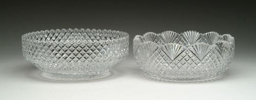 TWO CUT GLASS BOWLS. Lot consists of two bowls one in strawberry diamond and fan pattern and the other in strawberry diamond cut pattern. SIZE: 9-1/4 in. dia and 10 in. dia respectively. CONDITION: Very good to excellent. Estate of Edwin Schiebel Sr. 5-60227, 5-60228