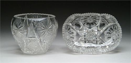 TWO CUT GLASS BOWLS. One is cut in hobstar and fan pattern and the other is in the hobstar and feathered star pattern. SIZE: 10 in. l and 7-3/4 in. dia. respectively. CONDITION: Minor edge roughness, slight chips to star cutting, otherwise very good. Estate of Edwin Schiebel Sr. 5-60196, 5-60197