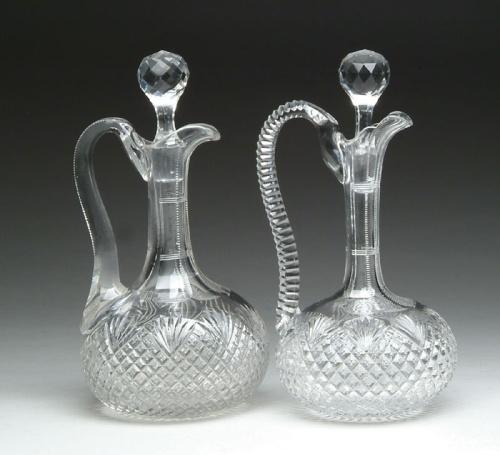TWO CUT GLASS DECANTERS. Two cut glass handled decanters are cut in strawberry diamond and fan pattern with lapidary stoppers. SIZE: Approx. 11-1/2 in. t. CONDITION: Two heat cracks where top of handle is attached, otherwise very good. Estate of Edwin Schiebel Sr. 5-60232, 5-60233