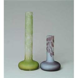 Lot 1293 TWO CUT-DOWN GALLE VASES. Lot of two Galle vases have been cut down. 1) Purple buds against a frosted background. Signed on side in cameo "Galle". SIZE: 5-1/2" t. CONDITION: Very good except as noted. 2) Lime green cameo thistle design against a frosted light pink to cream background. Signed on side in cameo "*Galle". SIZE: 9" t. CONDITION: Some minor scuff marks to edge of foot, otherwise good except as noted. 5-70141 (400-600)