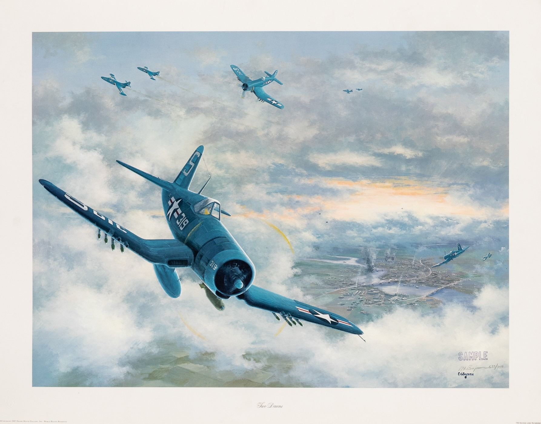 'Two Dawns' F4U Corsairs in flight, by R.A. Benjamin, Frame House Gallery, Inc., 1987, limited edition signed lithograph numbered 633/750, signed in pencil at the bottom right corner, 29.5 x 23 inches. Stamped 'Sample' in the lower right corner. Very good.