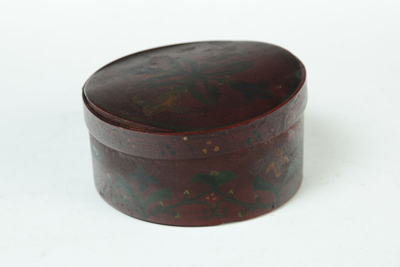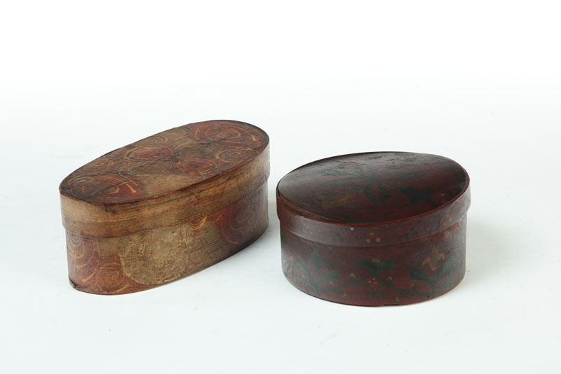 American, 2nd half-19th century, bentwood. Both have lapped seams and original paint. Round with iron tacks and flowers on red, 3"h. 6 1/2"d., and oval with glued seam and flowers. Edge loss. 3 12/"h. 9"w.